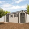 - Classic shed design with architectural details and metal-reinforced shingle-style roof panels