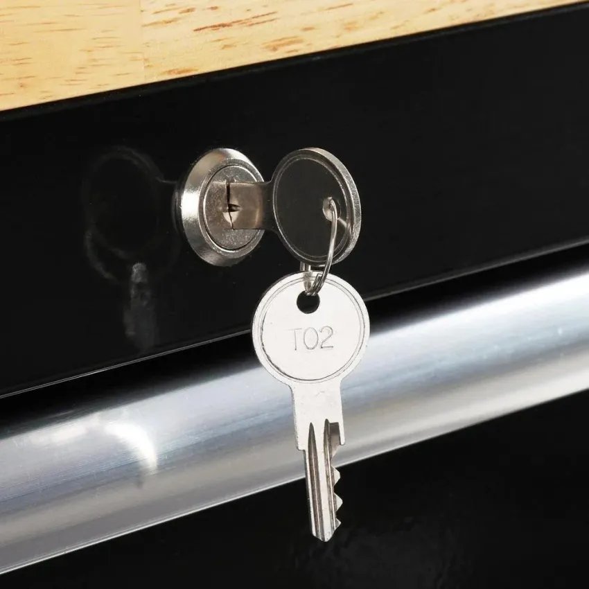 The Husky 62 in. 14-Drawer Mobile Workbench is a tool cabinet that combines the perfect blend of drawer storage capacity and functional work surface area for the tool enthusiast. This rolling tool cabinet has heavier 21-Gauge steel. This workbench is 24 in. deep. which is 6 in. deeper than most standard rolling tool cabinets. providing more usable storage space that is strong enough to support 1.600 lbs. and has 31.721 cu. in. capacity. The 1 in. thick solid wood top is sealed with a protective polyurethane coating to protect it from the elements. The workstation is equipped with a power center with 6 outlets and 2 USB ports. Premium drawer liners are included to help keep tools from moving around. Each drawer is equipped with 100 lbs. rated soft closing ball bearing slides. The 2 deeper bottom drawers have double 100 lb. rated slides to enable you to store your heavier bulk items. This mobile work center has 6 large. 5 in. x 2 in. all swivel casters and a steel tubular side handle. which allow you to easily move around. even when fully loaded. The Mobile Work Center also has an internal keyed locking system. with 2 keys provided. for added security. Features Ball Bearing Slides.Lockable.Soft Close Drawers.Wheel Locks.Worktop Material Steel Returnable 90-Day Top Material Wood Weight Capacity (lb.) 1600 Tools Product Type Tool Storage Number of Trays No Trays Grade General Purpose Color Family Black Holding Capacity (cu in.) 31721 Color/Finish Gloss Black Number of Wheels 6 Drawer Slide Weight Rating (lbs.) 100 Frame Steel Gauge 21 Number of Drawers 14 Drawers Included Keyed Lock Number of Shelves No Shelves Tool Storage Product Type Mobile Workbench Tool Chest Size Large Product Weight (lb.) 330 lb Manufacturer Warranty 3 Year Limited Warranty Nominal Width 62 Product Height (in.) 37.7 in Product Depth (in.) 24 in Product Width (in.) 62 in