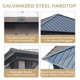 This hardtop gazebo has a galvanized steel roof and the entire structure is rust-resistant powder-coated galvanized steel. It also comes with 4 zippered mosquito net