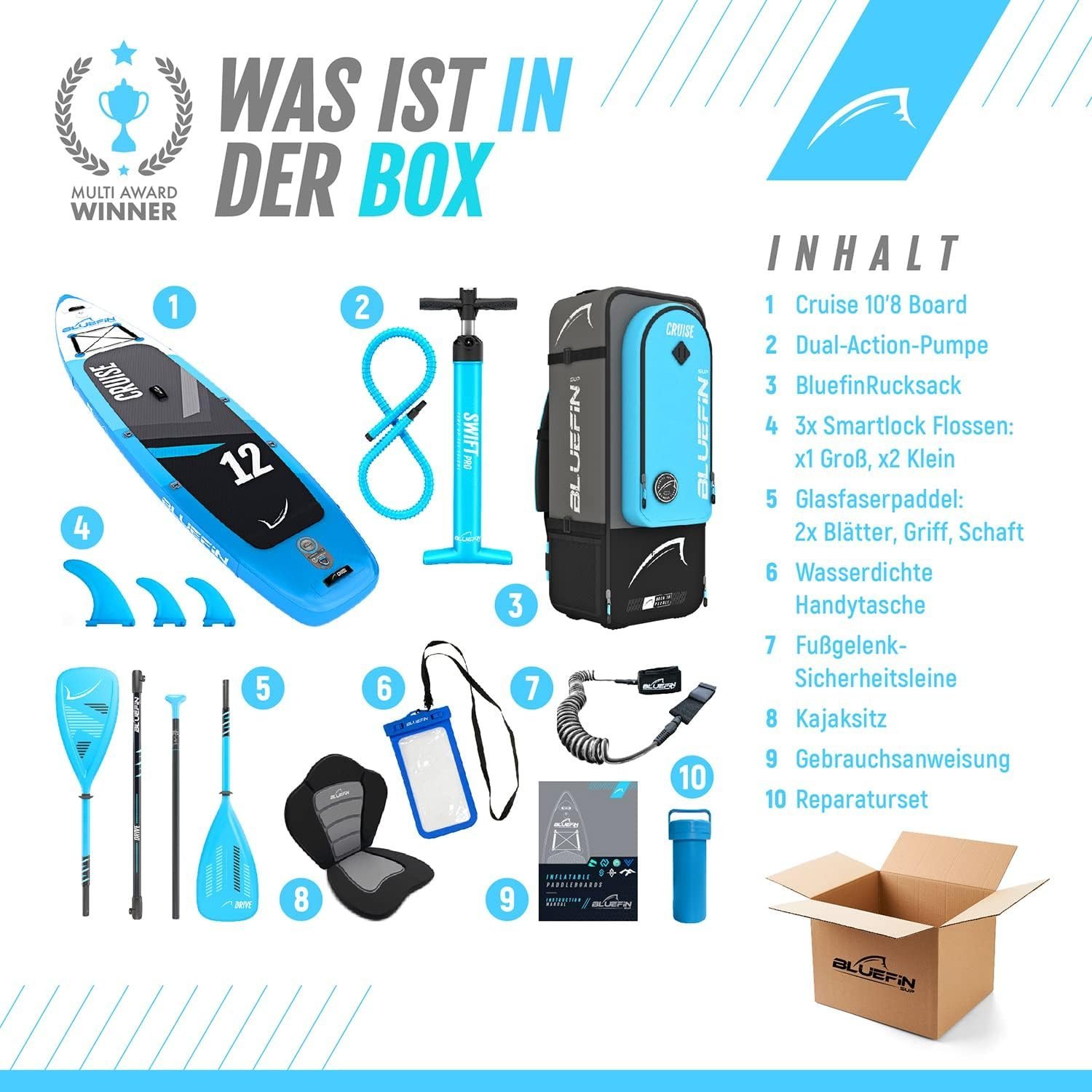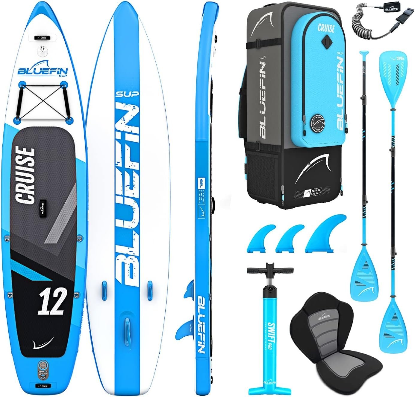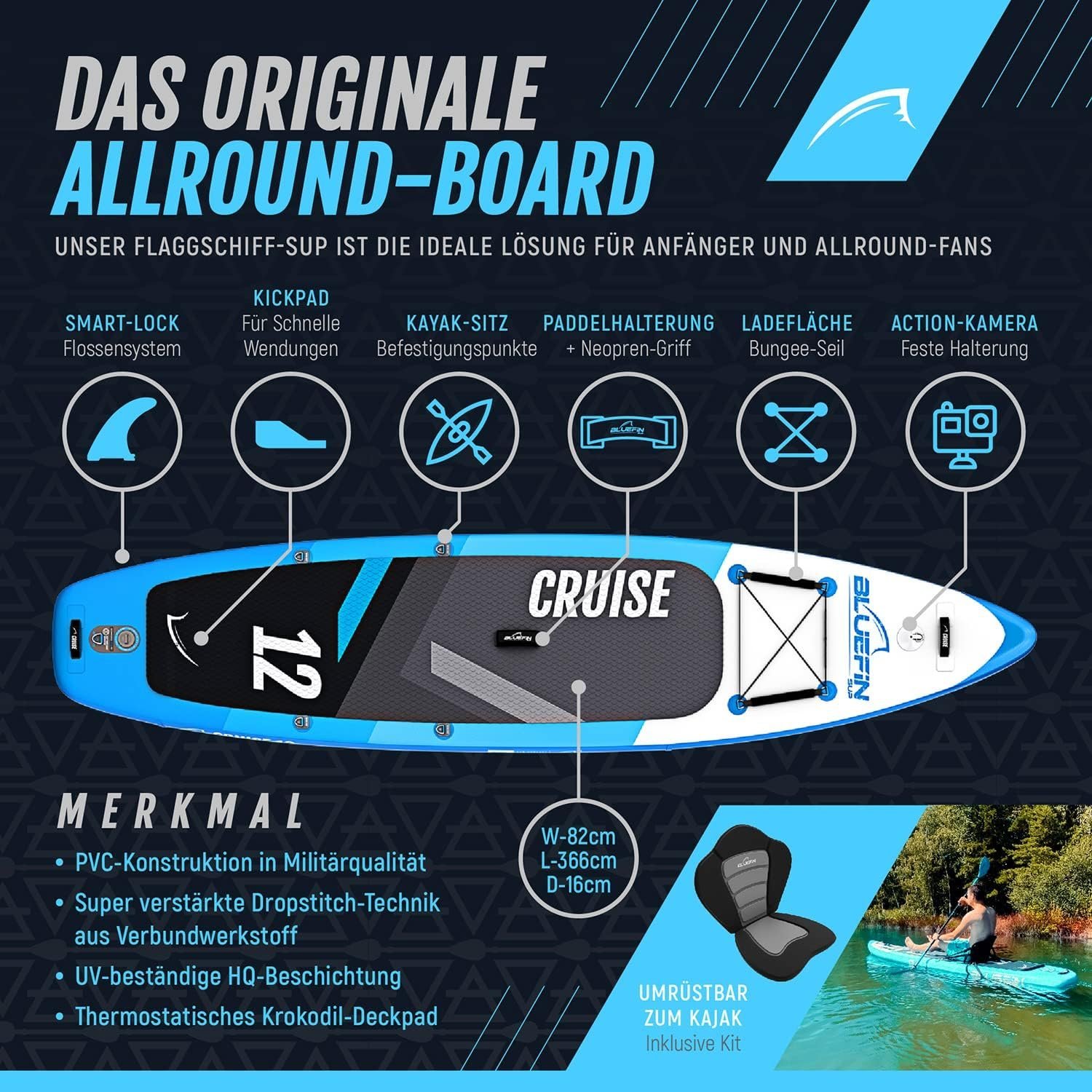 12 – DU SUCHST NACH DEM STABILSTEN. VIELSEITIGSTEN. ALL-INKLUSIVE SUP-PAKET? Nur Bluefin verwendet 1000 Denier Exo Surface Laminierung PVC & Pro Weave Drop-Stitch. Diese Materialien machen unsere Boards so robust. dass sie bis zu 28 PSI aushalten können und die stabilsten. sichersten. Stand Up Paddel Boards sind. die Du jemals kaufen wirst. Cruise 12’ + Hund oder sitzende Mitfahrer: 366 cm x 77 cm x 15 cm