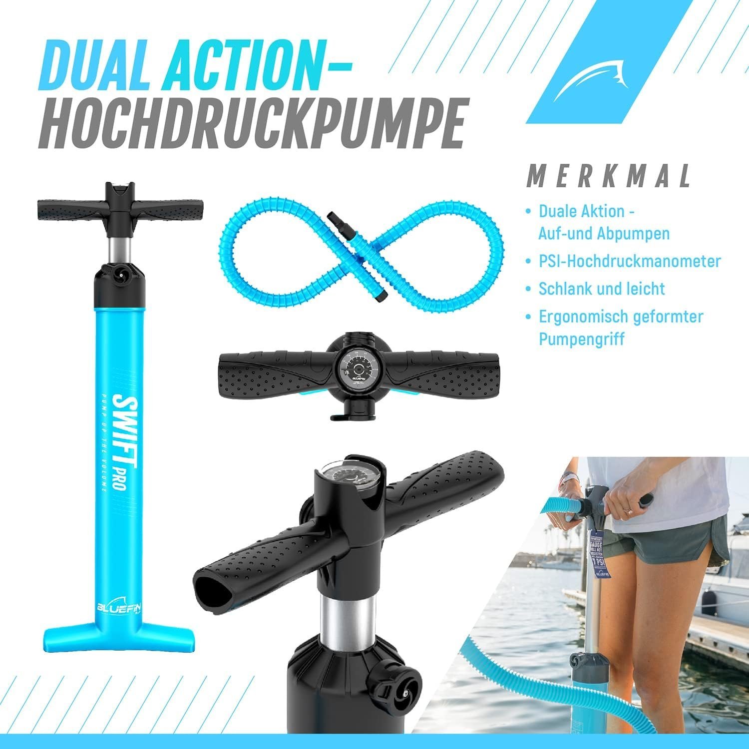 SMART LOCK FINNE & DOUBLE-ACTION LUFTPUMPE – Unsere vielseitige 8-Zoll Center-Finne mit optimiertem Design bietet ultimativen Gleitkomfort und Vielseitigkeit beim Paddeln. Keine Metallteile. die verloren gehen können. In Sekundenschnelle sicherzusammengebaut. Die Doublel-Action Luftpumpe pumpt das aufblasbare Standup Paddle Board sowohl in der RUNTER als auch RAUF-Bewegung auf.