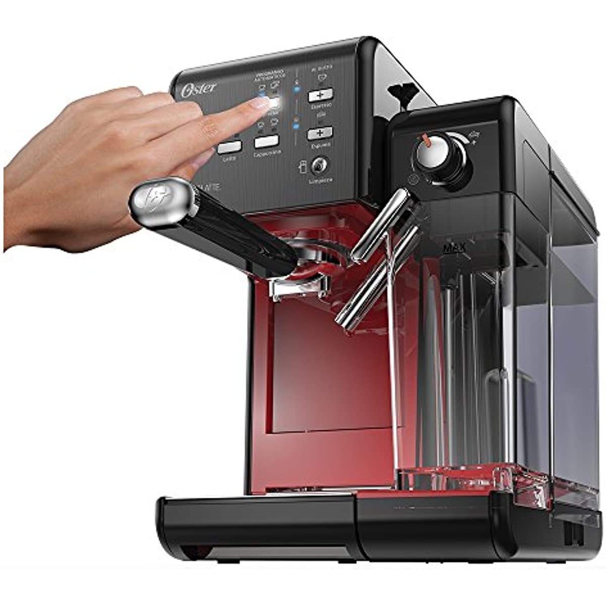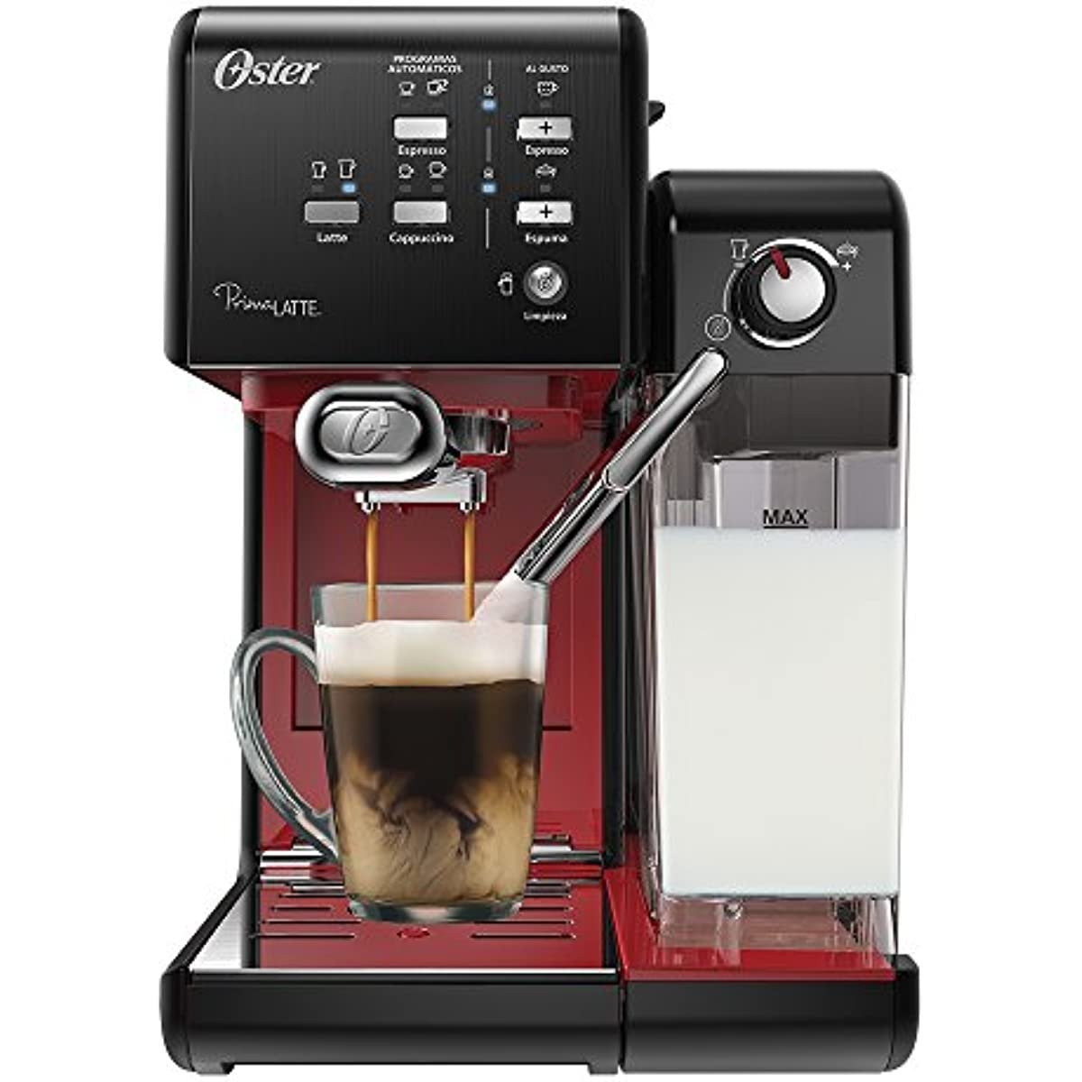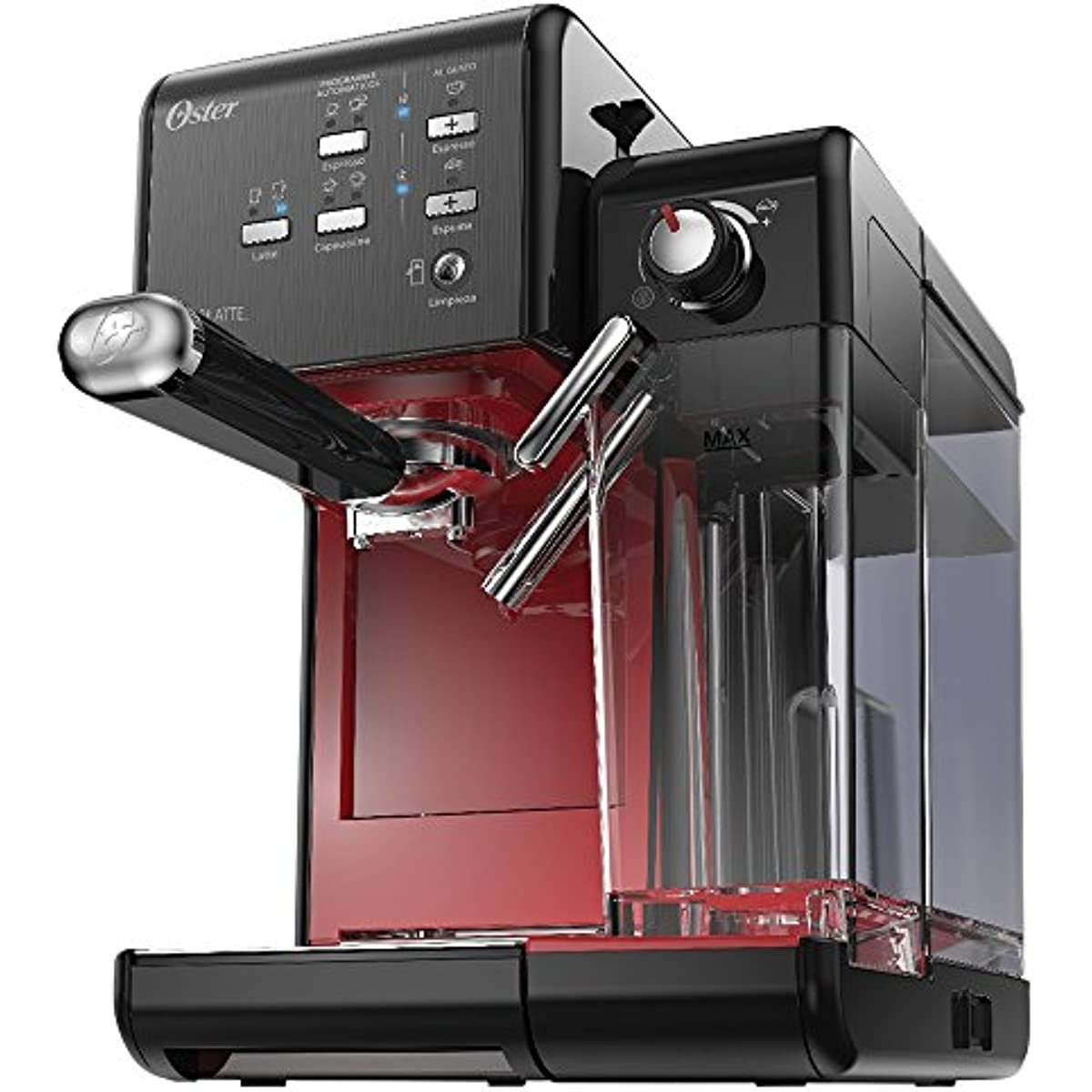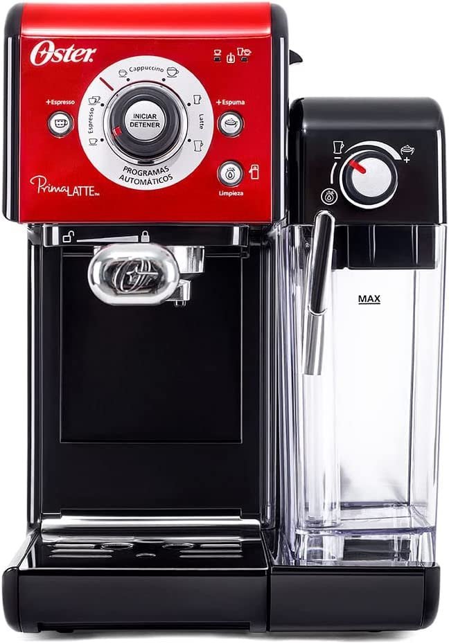 A Cafeteira Espresso Oster é compacta e possui bomba italiana que oferece o preparo simples de cafés gourmet. Com recipiente de água removível e capacidade para até 1. 2L. a cafeteira Espresso Oster mantém a temperatura da água e as propriedades do grão. Prepara até 2 cafés de uma só vez. Vaporizador para preparar cappuccinos e lattes. Para uma bebida cremosa e com espuma. Com 19 bar de pressão. prepara expressos cheios de sabor e excelente qualidade de maneira muito fácil. apenas apertando um botão. Diferencias: – Bomba italiana: 19 bar de pressão. – Faz espressos e cappuccinos. – Vaporizador para leite. Ao usar seu eletrodoméstico pela primeira vez: 1. Verifique se o produto está desconectado e se o botão Liga/Desliga está na posição Desligado ‘O’. 2. Remova adesivos e etiquetas do produto. Nota: remova a tampa vermelha da base do reservatório de água. 3. Remova e lave o reservatório de água. o reservatório de leite. o porta-filtro. os 2 filtros e a colher de medição com detergente neutro e água. Enxágue bem cada um e coloque de volta no eletrodoméstico. Nota: o porta-filtro e o reservatório de água não podem ser lavados na máquina de lavar louça. 4. Siga as instruções para preparar o produto (devem ser concluídas antes do primeiro uso).