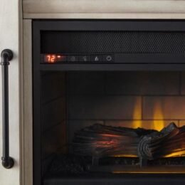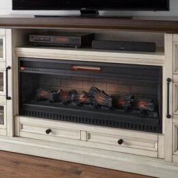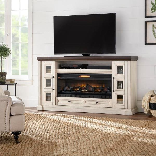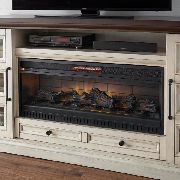 The 72 in. Electric Fireplace will transform your living room or family room into a warm. comfortable and stately showplace. The quality construction of hardwoods and laminates are made even more impressive by the craftsmanship of the Antique White with Warm Charcoal Top finish. Enjoy family gatherings. game day parties and date nights in front of a cozy fire. The Console offers realistic log and flames with energy efficient LED technology and 4 flame heights. Enjoy cozy fires year round with or without heat. With its 5.200 BTU infrared heater. the electric fireplace can warm even the largest rooms. Control the temperature range. 62°F to 82°F and flame display with the handy remote control. The fireplace console can accommodate flat panel TVs and includes cabinets for storing media and gaming accessories. Now any room can be a cozy haven with the Fireplace Console. For flat panel TVs (not for use with CRT TVs) Sturdy hardwood construction Durable Antique White with Warm Charcoal Top finish Cabinets store your media and gaming accessories Console requires assembly 42 in. Infrared electric fireplace insert 1.500-Watt/5.200 BTUs of infrared heat Realistic logs and embers Temperature range control: 62°F to 82°F Easy set up plugs into standard 120-Volt/60 Hz electrical outlet.