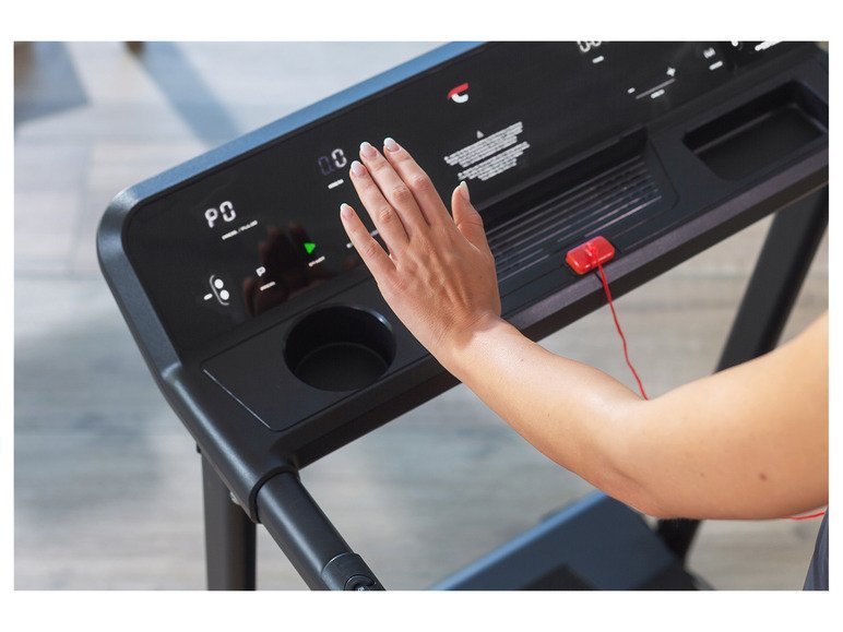 Der übersichtliche Computer inklusive Tablet- und Smartphone-Ablage mit 5 LED-Anzeigen ist leicht bedienbar und zeigt alle relevanten Werte auf einen Blick an. Aus den 12 Trainingsprogrammen kann man sich sein Programm aussuchen oder wie nach Vorgabe von Zeit. Entfernung oder ca. Kalorien nach eigenen Vorstellungen trainieren. Über die in den Handgriffen integrierten Handpulssensoren ist eine Pulsüberwachung beim Training möglich und über die Ferntasten lässt sich das Laufband ein- und ausschalten bzw. die Geschwindigkeit in 0.1-km/h-Schritten ab 1 km/h bis 12 km/h verstellen.