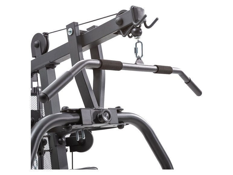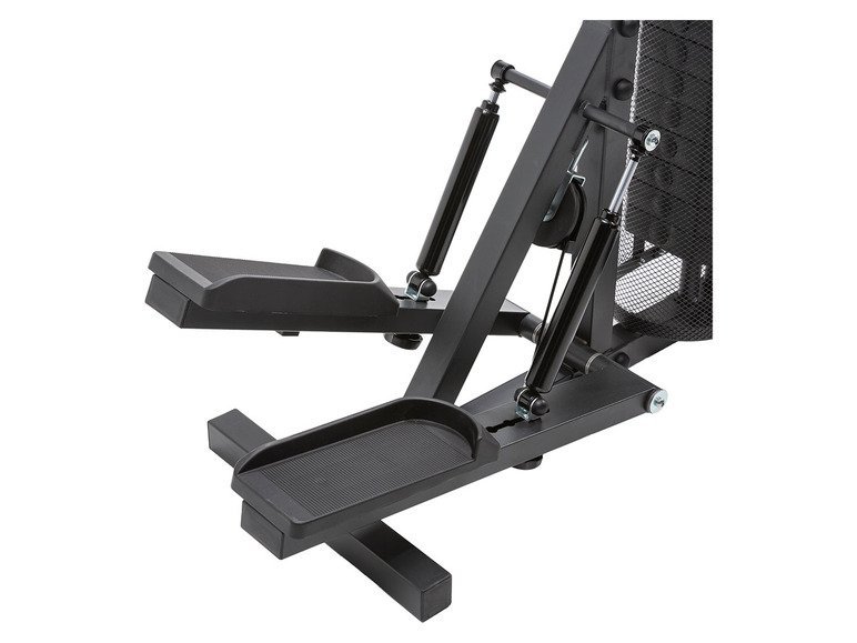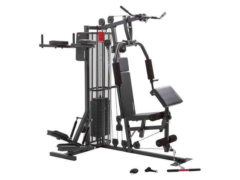 - Merkmale: • Über 45 Übungsmöglichkeiten • Redline-Design • Verbesserter. ergonomischer Komfortsitz mit mehrfach höhenverstellbarer Sitzfläche • Lordosestütze für ein rückengerechtes Training • Kombinierte Bankdrück- bzw. Butterflyeinheit Latissimus- und Curlstange. Beincurler • Inklusive Armcurlpult • Unterer Seilzug für Übungen wie Armcurls und Rudern • Zusätzliche Arm- und Beinmanschetten im Lieferumfang enthalten • Metall Trittplatte für Curl- Übungen im Stehen • Stepper mit besonders breiten Trittflächen und zwei Hydraulikzylindern (4-fach verstellbar) • Bauch – Station 2- fach unterschiedlich hoch montierbar • 12 Steckgewichte a ca. 5 kg = 60 kg Steckgewichte • Gewichtsbelastung je nach Art der Übung von ca. 5kg bis 90 k