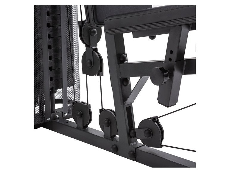 Das ca. 60-kg-Gewichtspaket lässt sich in 12 Abstufungen zu je 5 kg über einfaches Umstecken des Sicherungsstiftes einstellen. Zudem ist das Gewichtspaket durch ein optionales 10 kg Gewichtsset nachrüstbar auf insgesamt ca. 70 kg. Durch die Seilführung und die Umlenk-Konstruktion ist so. je nach Art der übung eine Gewichtsbelastung von ca. 5-90 kg möglich.
