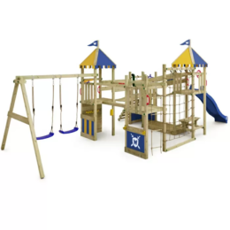 Our majestic Smart King children’s climbing frame is the ideal addition to your garden to encourage creative play. It combines versatile play elements that provide unforgettable childhood memories linked to the world of princesses. castles. and knights. Your children can sit together with their friends at the integrated picnic table or let off steam on the climbing extension. The Smart King has several platforms and towers as well as a balance beam that connects them. Here. little adventurers can develop their balance. The large sandpit is perfect for digging and building. while the authentic suspension bridge opens the door to endless fantasy worlds for your children.