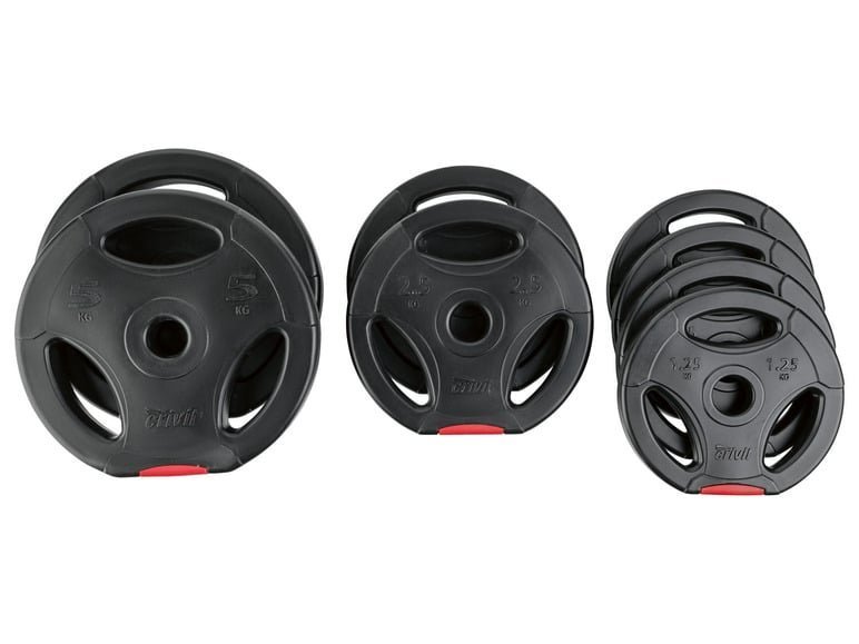 - 8-teilig: 4x ca. 1.25-kg-Scheibe. 2x ca. 2.5-kg-Scheibe. 2x ca. 5-kg-Scheibe