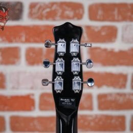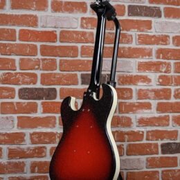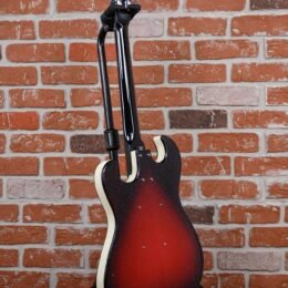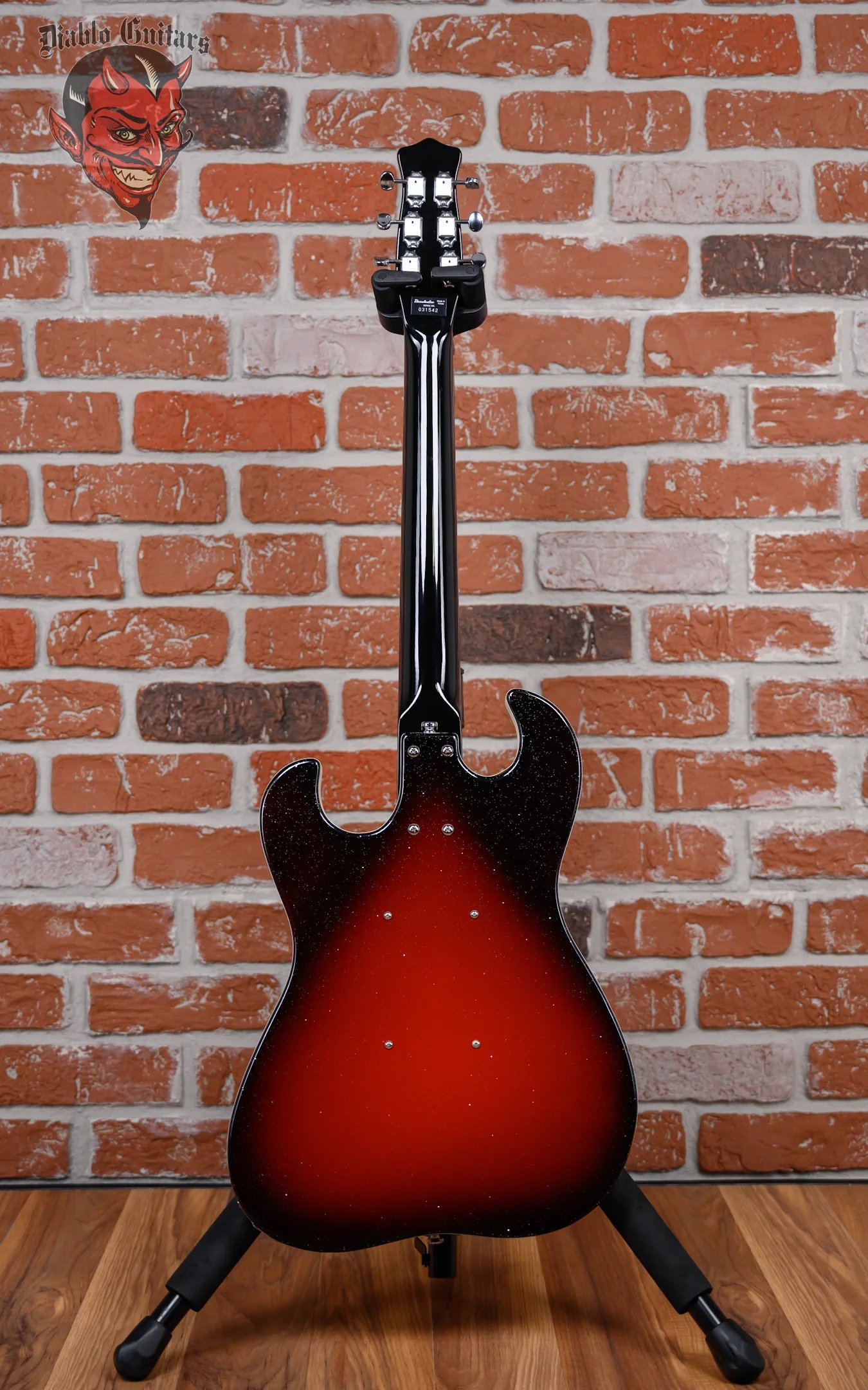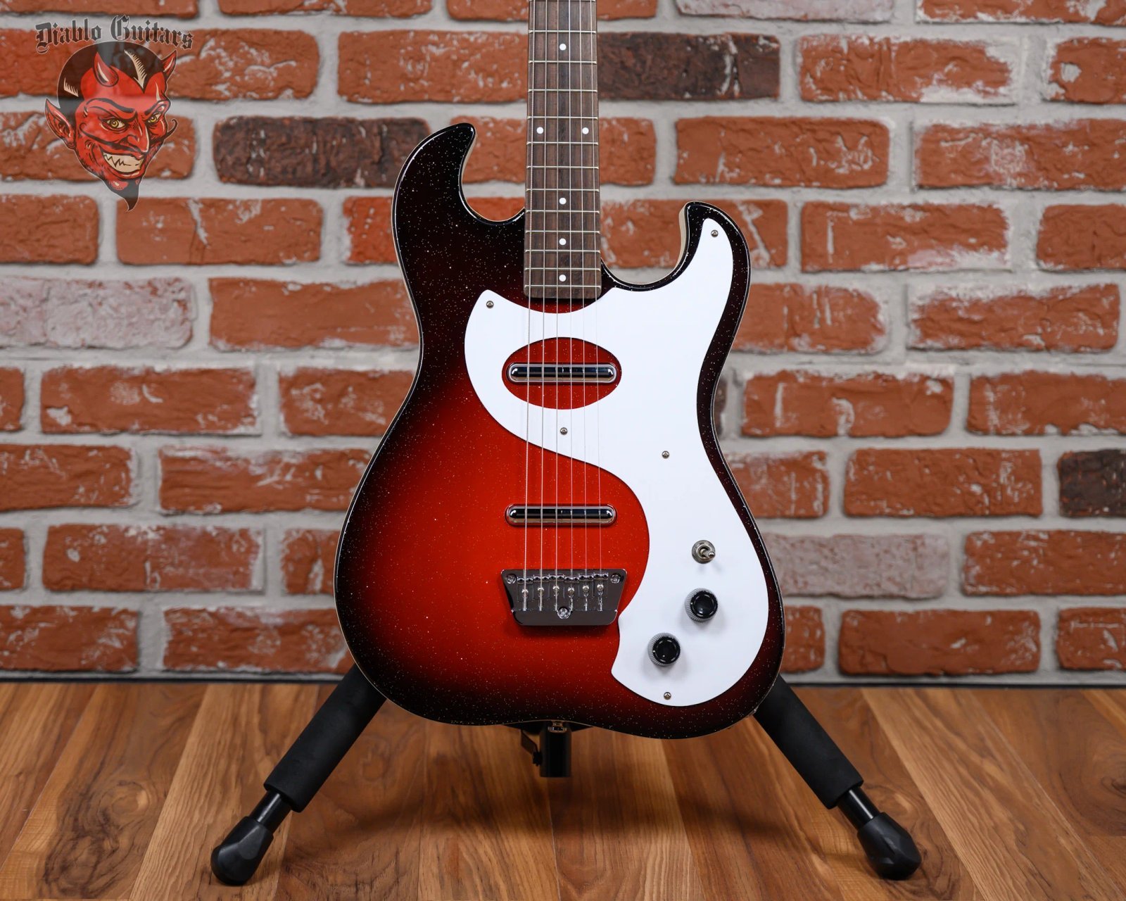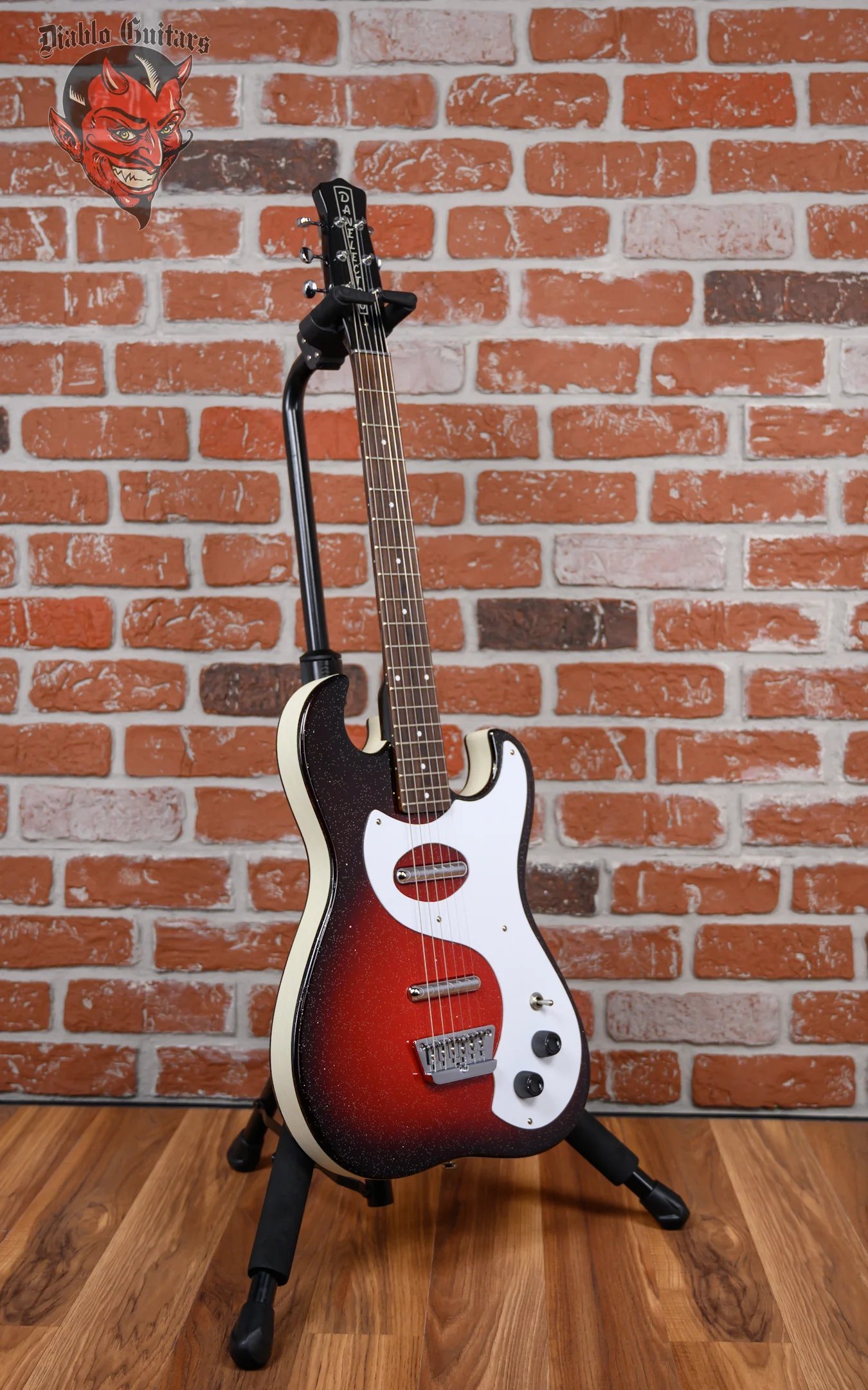 Danelectro Dano ’63 Reissue in Red Sparkle Burst finish made in 2014 with Hard Shell Case. This guitar features a solid plywood frame body with inner chambers with a tolex bound pressed wood top. maple neck and rosewood fingerboard with a black headstock. Equipped with a pair of danelectro lipstick single coils in the neck and bridge position. Controlled by 1 volume. 1 tone pot and a 3-Way toggle switch. The 25″ scale length neck has white dot inlays and white side markers with 22 medium jumbo frets on a 14″ radius with a medium C profile. The hardware is comprised of chrome style tuning machines with oval heads. an aluminum nut. a brass adjustable bridge and black knurled knobs with a single ply white pickguard.