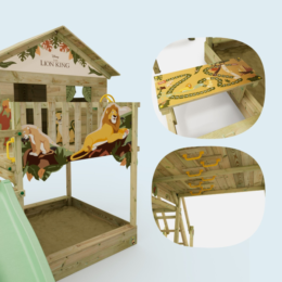 Both the expansive playhouse and the dual swing with climbing extension. along with the sandpit and play platforms. are adorned with carefully designed themes inspired by the wonderful universe of your children’s adored Disney characters. A thrilling dice game awaits at the picnic table. while a uniquely concealed climbing experience adds an extra layer of excitement above the sandpit. Allow your children to step into the roles of heroes in their personal adventures. surrounded by the presence of their cherished Disney characters