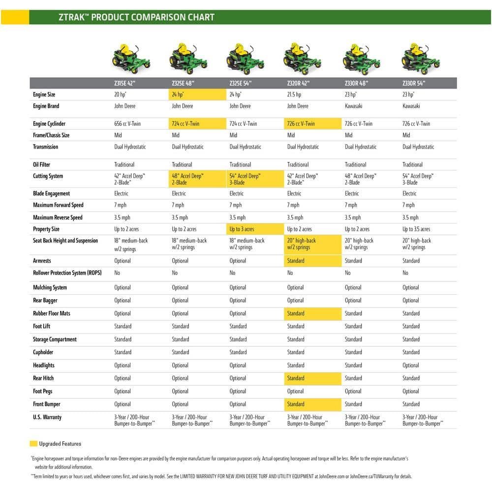 improved ride quality and durability with a tougher frame and larger front tires. Easy to operate. the 21.5 HP V-Twin John Deere engine delivers a smooth. powerful performance. The 42 in. (107-cm) Accel Deep mower deck produces a superior lawn at higher mowing speeds and is easily equipped to bag or mulch.21.5 HP V-twin John Deere engine for powerful performance during tough mowing conditions42 in. accel deep mower deck delivers a superior lawn at higher mowing speedsConvenient foot lift with adjustment dial is used to easily raise the mower deck for setting cutting heights from 1.25 in. to 4.5 in.Large 3 Gal. fuel tank ensures you have hours of mowing time on a single fillIntegrated park brake activates when you are done mowing. automatically engaging when the steering levers are in the outward positionFinish faster with mowing speeds up to 7 mph. dual EZT transmissions and large 18 in. drive tiresStandard LED lights for better visibility on overcast days or in dusk conditionsRide in comfort with 20 in. adjustable. custom-tailored high back seat with armrestsFloor mats and covered tool storage are conveniently standardFoot platform is easily removed for access to the top of mower deck for maintenance and cleaningMotion control levers can be adjusted for greater comfortOn-the-go tracking adjustment allows user to easily adjust motion control levers from the seat when levers are out of alignmentDo more than mow with optional attachments. the bagger BUC11342. mulch control kit BUC10704 and hitch BUC11477 are each sold separatelyBe sure to register your 3-year/200-hour bumper to bumper warranty and stay connected with your servicing John Deere dealerHassle free ownership – inspected. tested and spported: a John Deere authorized technician will perform a thorough 10 point pre-delivery inspection on all new John Deere mowers prior to sale