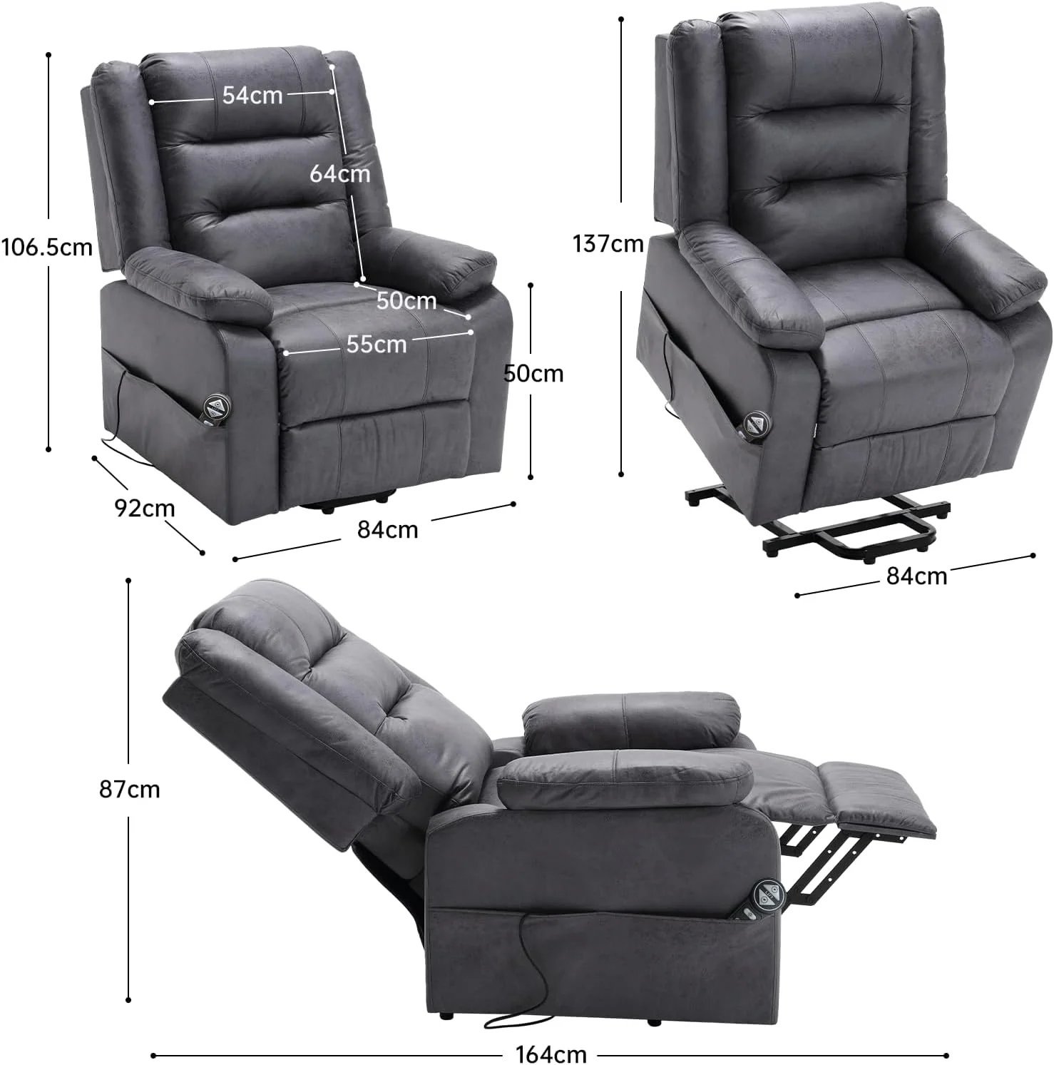 Fernsehsessel. Massage, Wärme, und Aufstehhilfe in einem stilvollen Relaxsessel aus Grau Wildleder.