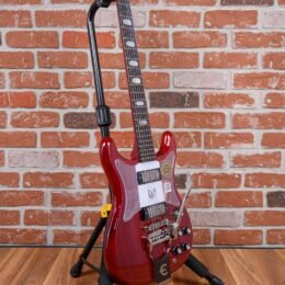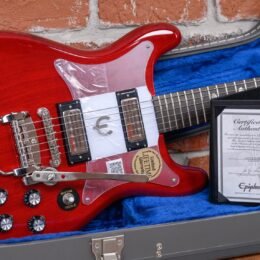 Epiphone 50th Anniversary 1962 Crestwood Custom Reissue in Cherry finish made in 2014 with Original Hard Shell Case. This guitar features a solid mahogany body. mahogany neck and rosewood fingerboard. Equipped with a set of Epiphone Classic mini-humbuckers in the neck and bridge positions. Controlled by 2 volume pots. 2 tone pots and a 3-Way toggle switch. The 24.75″ scale length neck has mother of pearl oval inlays and white side markers with 22 medium jumbo frets on a 12″ radius with a slim taper profile. The hardware is comprised of chrome Wilkinson Vintage tuning machines with green tulip heads. a plastic nut. a Locktone Tune-O-Matic bridge w/ Tremotone tailpiece and top hat reflector knobs with a clear acrylic pickguard.