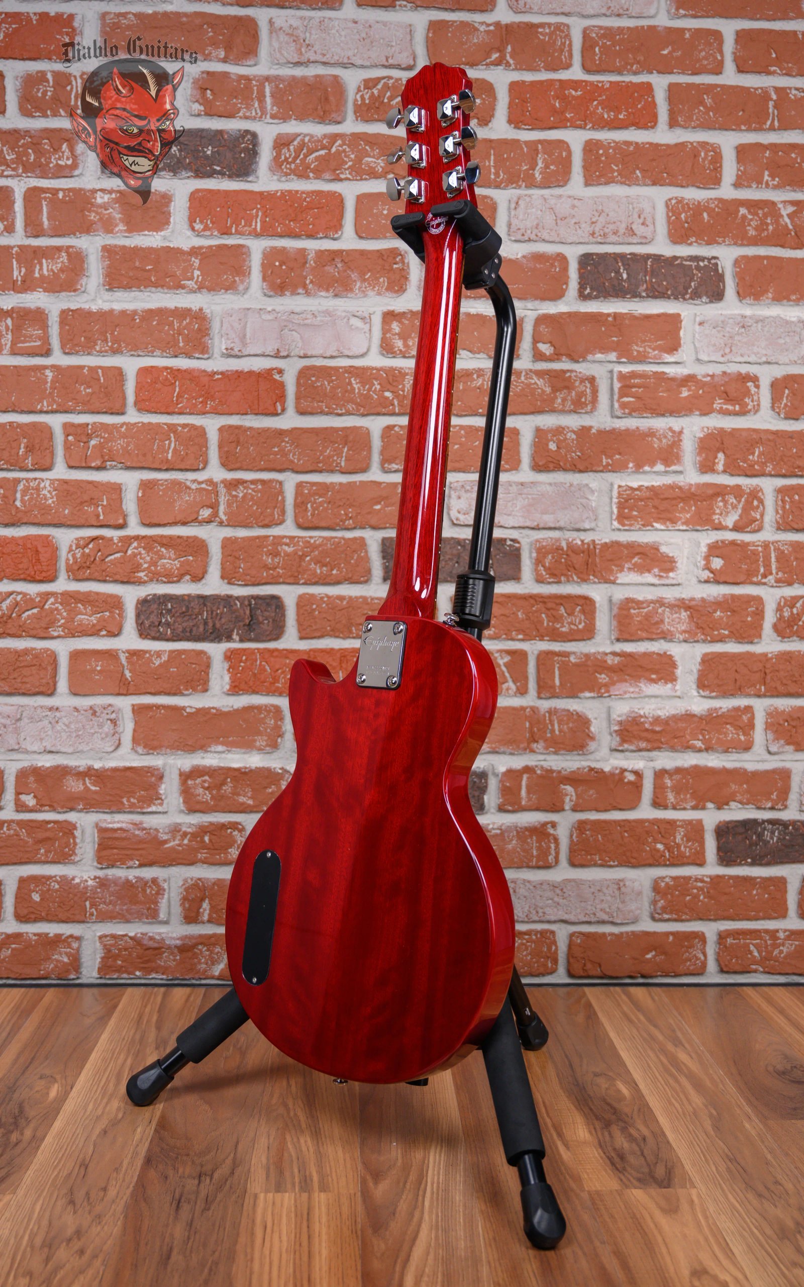 Epiphone Les Paul Jr. in Cherry finish made in 2010 with hard shell case. This guitar features a solid laminated mahogany/alder body. mahogany neck and rosewood fingerboard. Equipped with an Epiphone 700T in the bridge position. controlled by 1 volume pot and 1 tone pot. The 24.75″ scale length neck has pearloid dot inlays and white side markers with 22 medium frets on a 12″ radius with a slim taper profile. The hardware is comprised of nickel Epiphone stamped tuning machines with cloche heads. a plastic nut. an Epiphone compensated wraparound bridge and black speed knobs with a 3 ply black on white pickguard.