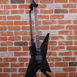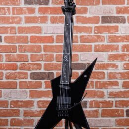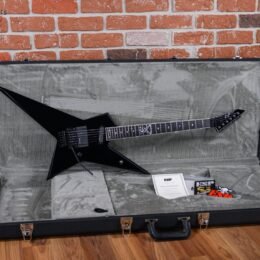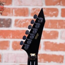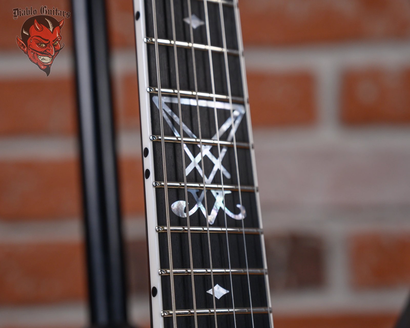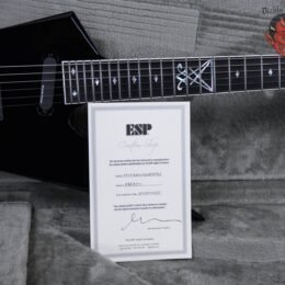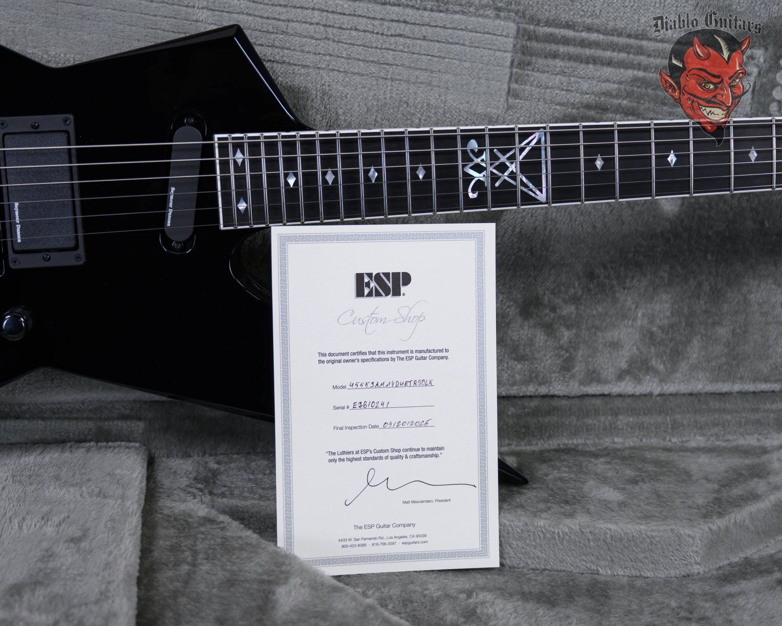 New ESP Custom Shop Sammy Duet Signature RS FR in Black finish made in Japan in 2025 with Original Hard Shell Case. This guitar features a solid mahogany wings body. 3-piece mahogany neck-thru and bound ebony fingerboard with bound reverse headstock. Equipped with a slanted direct mount Seymour Duncan AS-1 Blackout Strat Single Coil in the neck position and a Seymour Duncan AHB2B Blackout Metal Humbucker in the bridge position. Controlled by one master volume knob and a 3-way toggle switch. The 24.75″ scale length neck has mother of pearl diamond inlays. “Sigil of Lucifer inlay at the 11th-13th frets and 24 extra jumbo stainless steel frets on a 305mm radius with a thin U neck profile. The hardware is comprised of black Sperzel trim lok tuning machines. a Floyd Rose R2 locking nut. a Floyd Rose original double locking tremolo bridge and knurled black dome knobs.