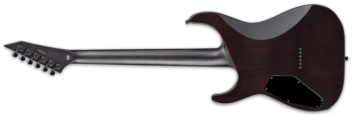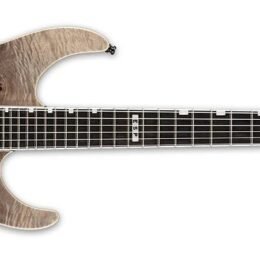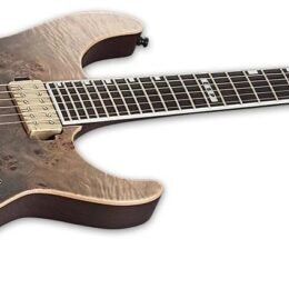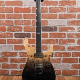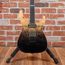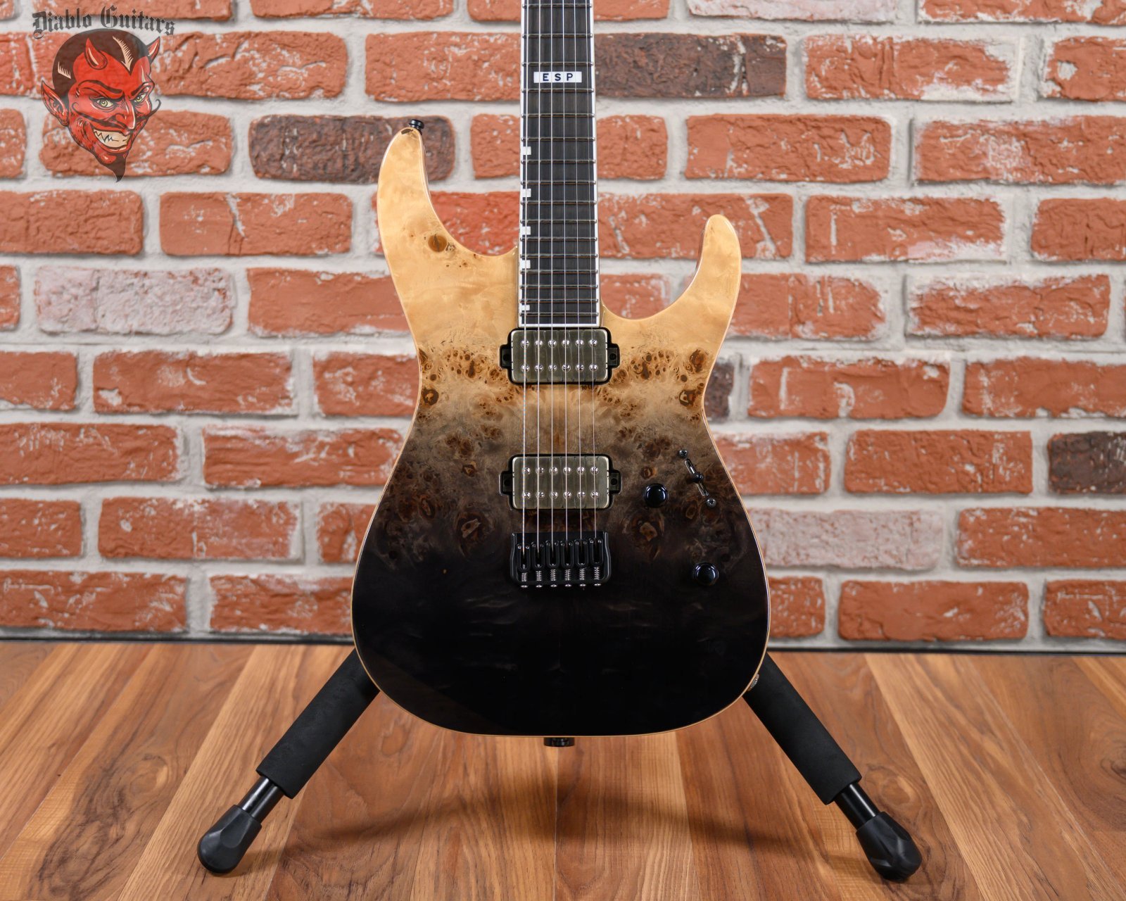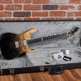 New ESP E-II M-II NT in Burled Maple Top Black Natural Fade finish made in 2021 with Original Hard Shell Case. This guitar features a solid mahogany body with a buckeye burl maple top. 3-Piece maple set-thru neck and ebony fingerboard with a reverse bound/color matched headstock. Equipped with a set of Bare Knuckle Aftermath Tyger humbuckers controlled by 1 volume. 1 tone pot and a 3-Way blade switch. The 25.5″ scale length neck has pearloid offset block inlays and Luminlay side markers with 24 extra jumbo frets on a 305mm radius with a thin U profile. The hardware is comprised of black Gotoh Magnum Lock tuning machines with cloche heads. a bone nut. a Hipshot Hardtail 6 bridge and black knurled dome knobs.