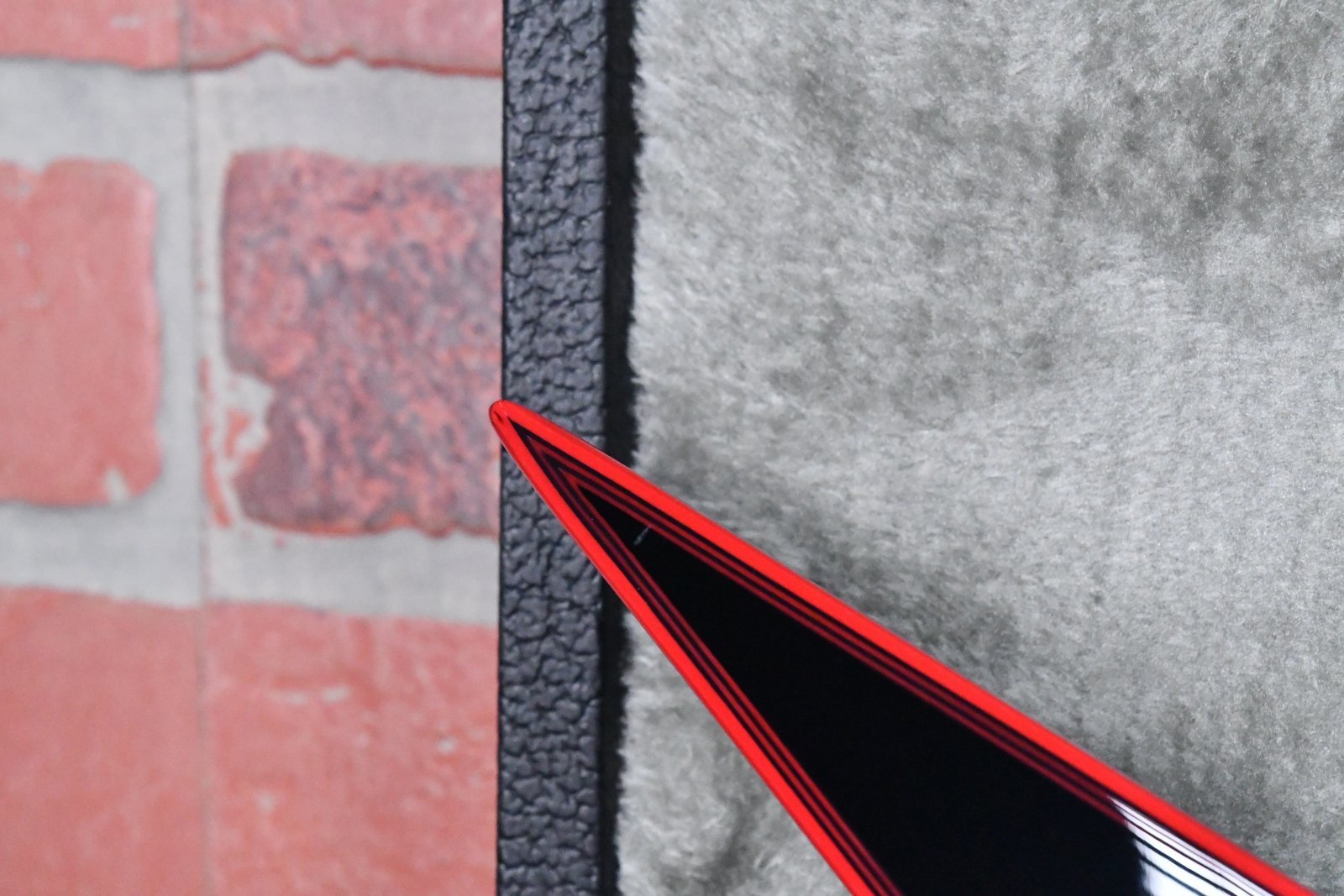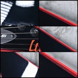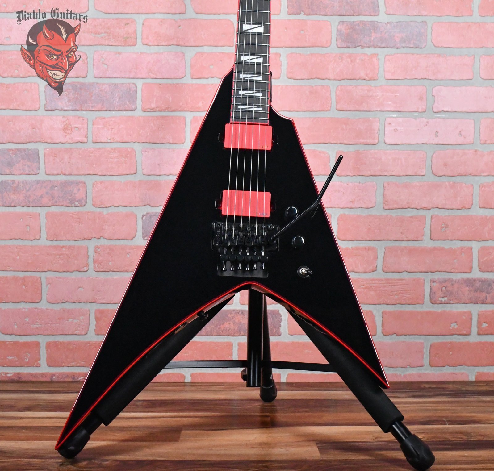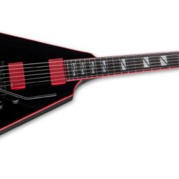 New ESP LTD GH-SV Gary Holt Signature V in Black Finish Made in 2024 with original hard shell case. This guitar features a multi-ply bound solid mahogany body with a maple cap top. 3-piece mahogany neck-thru and red bound macassar ebony fingerboard with a bound/color matched headstock. Equipped with an active set of EMGs. an 89R Red in the neck position and an 81 Red in the bridge position. Controlled by 2 volume pots with push/pull coil tap and a 3-Way toggle switch. The 24.75″ scale length neck has pearloid split block inlays and 22 extra jumbo stainless frets on a 350mm radius with a thin U profile. The hardware is comprised of black Grover Mini Rotomatic tuning machines with mini kidney bean heads. a Floyd Rose Locking nut. a Floyd Rose 1000 Series Double Locking Tremolo bridge and knurled black dome knobs.