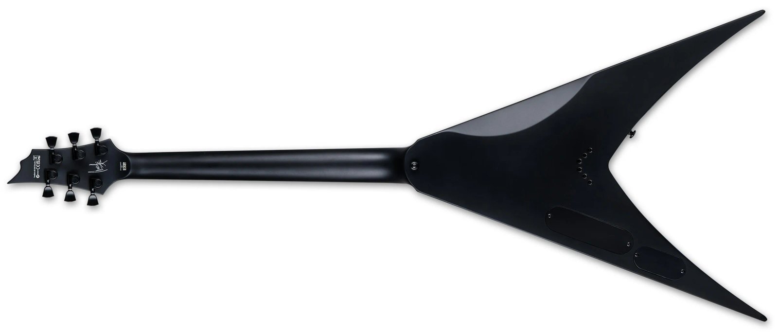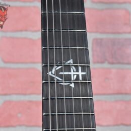 New ESP LTD Signature Series Hex-6 Nergal Signature in Black Satin Finish made in 2024 with original hard shell case (B-stock). This guitar features a solid mahogany body. 3-piece maple neck-thru and bound macassar ebony fingerboard with an FRX bound headstock with mother of pearl inlay. Equipped with a Fishman Fluence Modern humbucker alnico black chrome in the neck position and a Fishman Fluence Modern humbucker ceramic black chrome in the bridge position. Controlled by one master volume pot with push pull 2nd voicing and a 3-way toggle switch. The 25.5″ scale length neck has pearloid “Opvs Contra Natvram” inlay at the 12th fret. Luminlay side markers and 24 extra jumbo frets on a 350mm radius with a thin U profile. The hardware is comprised of black LTD sealed die-cast locking tuning machines with keystone heads. a molded nut. a Tone Pros Locking TOM w/ string thru bridge and knurled black dome knob.