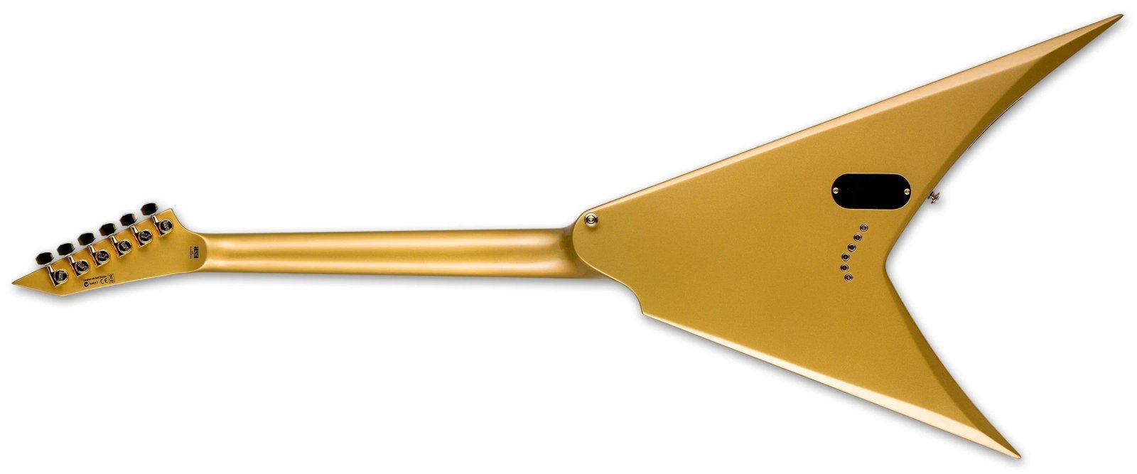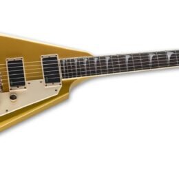 New ESP LTD Kirk Hammett KH-V in Metallic Gold finish made in 2023 with Original Hard Shell Case (B-Stock). This guitar features a solid korina body. 3 piece maple neck-thru and bound macassar ebony fingerboard. Equipped with a set of EMG Bone Breakers in the neck and bridge positions. Controlled by 1 volume pot. 1 tone pot and a 3-way toggle switch. The 25.5″ scale length neck has symmetric wave inlays inlays and 24 extra jumbo frets with an extra-thin “U” shaped neck profile. The hardware is comprised of gold LTD locking tuning machines. a molded nut. TonePros Locking Tune-o-Matic bridge w/string-thru body and knurled gold dome knobs with a single-ply cream pickguard.