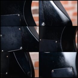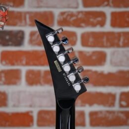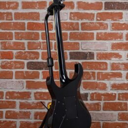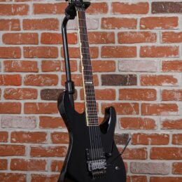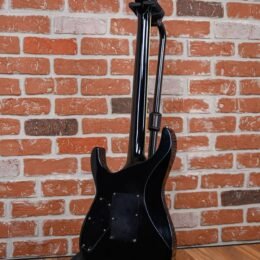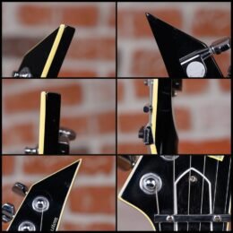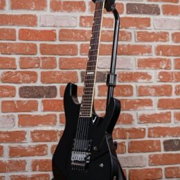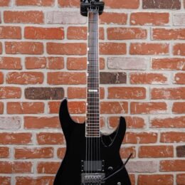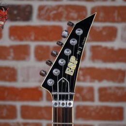 Vintage ESP M-1 Custom Pre Lawsuit Headstock in Black finish made in 1987 with Original Hard Shell Case. This guitar features a solid alder body. 3-piece maple neck-thru and bound rosewood fingerboard with a bound lawsuit headstock. upgraded with an EMG 81 in the bridge position and Controlled by one master volume pot with 2-way mini toggle kill switch. The 25.5″ scale length neck has pearloid offset block inlays. black side markers with 24 jumbo frets on a 305mm radius with a thin U profile. The hardware is comprised of chrome gotoh sealed Die-Cast tuning machines with cloche heads. a Floyd Rose locking nut. a Floyd Rose original double locking tremolo. and black knurled dome knobs.