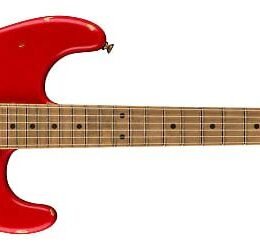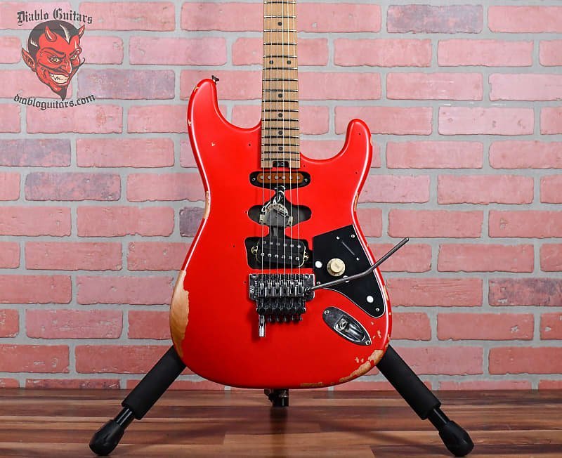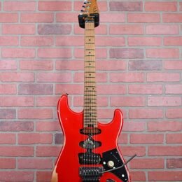 EVH Frankenstein Relic Series in Red finish made in 2023 with Original Gigbag. This guitar features a solid basswood body. quartersawn maple neck and maple fingerboard. Equipped with a dummy single coil in the neck position and an EVH Wolfgang Humbucker in the bridge position. Controlled by one master 500k Bourns Low Friction volume knob. The 25.5″ scale length neck has black dot inlays and 22 jumbo frets on a compound 12��-16�� radius with an EVH modified “C” backshape neck profile. The hardware is comprised of aged chrome EVH-branded Gotoh tuning machines. a Floyd Rose locking nut. an EVH-branded Floyd Rose Locking tremolo with an EVH D-Tuna bridge and white Stratocaster-style skirt knob labeled “Tone” with a custom EVH Frankenstein black control guard pickguard.