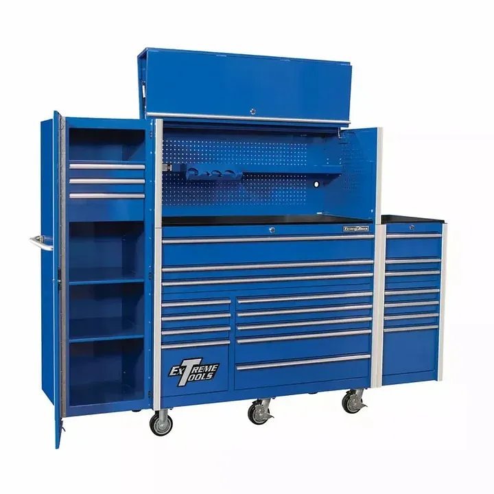 55” 12-Drawer Roller Cabinet (RX552512RC)Extreme Tools® RX Series RX552512RC 55” 12-Drawer Roller Cabinet is the latest in our RX Series. This professional quality tool box features 3 extra long drawers with a support bar to provide strength and prevent warping or twisting. Patented self-latching. Quick Release drawer pulls keep drawers closed even when moving. Each drawer uses full-extension ball bearing slides that let you load 100-200* lbs per drawer (*drawers with double slides.) This huge roller cabinet gives you loads of space at an affordable price with the assurance of Extreme Tools® quality.Key Features:• Overall Dimensions: 55”W x 25”D x 46”H• Heavy duty 12 gauge steel frame construction • 3 Extra long drawers with added support bar to fit large tools• Full-width. polished extruded aluminum drawer pulls• Patented Quick Release self-latching drawer pulls keep drawers closed even when moving• 25” Cabinet depth• Full-extension ball bearing slides on drawers allow drawers to open and close smoothly• Ball bearing slides load rated 100 lbs per set of slides drawer• Deep drawers with 2 sets of slides hold up to 200 lbs. • AkzoNobel high gloss powder coat finish• Tubular. coded security lock and keys• Tubular stainless steel side handle on roller cabinet included• 6 – 5”x 2” Caster (4 locking swivels and 2 rigid)• Foam drawer liners included• Total Capacity: 25.799 cu in• Net Weight: 409 lbs• Shipping Weight: 434 lbsExterior Drawer Dimensions:1 Drawer – 51.4”W x 23.3”D x 5.8”H;2 Drawers- 51.4”W x 23.3”D x 2.8”H;3 Drawer – 15.7”W x 23.3”D x 2.8”H;1 Drawer – 15.7”W x 23.3”D x 11.7”H 3 Drawer s- 34.1”W x 23.3”D x 2.8”H;2 Drawer – 34.1”W x 23.3”D x 5.8”H;55″ Hutch (RX552501HC)Key Features: •Hutch features adjustable shelf with built-in slots/holes for organizing tools•Power Tool Rack and Power Strip are included•Steel peg board side and back panels provide convenient space for hanging•High Gloss AKZO Nobel powder coat finish•Assembly Required•Dimensions: 55″W x 22.25″H x 25″D•Weight: 102 lbs. 19″ 3-Drawer Side Locker (RX192503SL) Extreme Tools® RX Series RX192503SL 19” 3-Drawer and 3-Shelf Side Locker is an add-on that provides expandability to the RX Series. This professional quality tool box features 3 drawers and 3 adjustable shelves. The top shelf was meant to cover the drawers. but can be moved to add versatility. Each drawer uses full-extension ball bearing slides that let you load 100 lbs per drawer or shelf. The adjustable shelves allow you to store large. bulky items with ease. This huge side locker gives you loads of space at an affordable price with the assurance of Extreme Tools® quality.Key Features:• Overall Dimensions: 19”W x 25”D x 61”H• 3 drawers and 2 adjustable shelves• Full-width. polished extruded aluminum drawer pulls• 25” Cabinet depth• Full-extension ball bearing slides on drawers allow drawers to open and close smoothly• Ball bearing slides load rated 100 lbs per set of slides drawer• AkzoNobel high gloss powder coat finish• Tubular. coded security lock and keys• Foam drawer liners included• Fits on the RX Series 72” or 55” models• Total Capacity: 8.092 cu in• Net Weight: 157 lbs• Shipping Weight: 175 lbs19” 7-Drawer Side Box (RX192507SB)Extreme Tools® RX Series RX192507SB 19” 7-Drawer Side Box is an add-on that provides expandability to the RX Series. This professional quality tool box features 7 drawers with our patented Quick Release. self-latching drawer pulls. Our sturdy drawer latches keep your drawers closed even when you are moving your tool box. Each drawer uses full-extension ball bearing slides that let you load 100-200* lbs per drawer. This convenient side box gives you loads of extra space at an affordable price with the assurance of Extreme Tools® quality.Key Features:• Overall Dimensions: 19”W x 25”D x 39”H• 7 drawers• Full-width. polished extruded aluminum drawer pulls• Drawers use our patented Quick Release. self-latching drawer pulls• 25” Cabinet depth• Full-extension ball bearing slides on drawers allow drawers to open and close smoothly• Ball bearing slides load rated 100-200* lbs per set of slides drawer*Drawers with double slides• AkzoNobel high gloss powder coat finish• Tubular. coded security lock and keys• Foam drawer liners included• Fits on the RX Series 72” or 55” models• Total Capacity: 8.091 cu in• Net Weight: 168 lbs• Shipping Weight: 183 lbsClick Here for PDF Schematic Drawing of RX552512RC