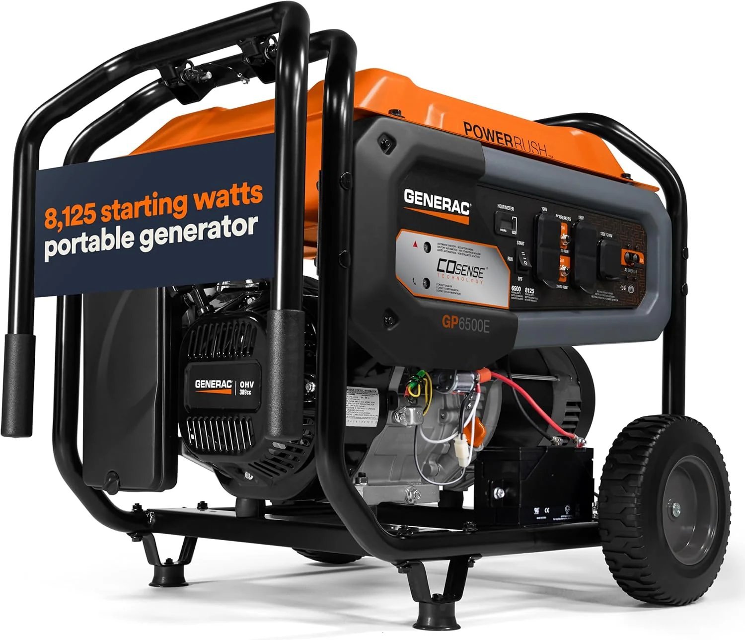 Generac’s GP6500 portable generator with COSENSE® Technology provides lots of power while protecting you and your home from carbon monoxide (CO) poisoning. If you inadvertently use the GP6500 indoors or in an enclosed space, COSENSE® WILL automatically shut off your unit when increased CO is detected. This unit also offers PowerRush™ Advanced Technology, which delivers more than a 40% increased starting capacity*. Generac’s OHV engine and large-capacity steel fuel tank ensures long engine life and run times, while the steel tube cradle provides added strength. The low-oil feature protects the generator from damage. The GP6500 can be easily transported across rough or difficult terrain with the heavy-duty wheels and easy fold-down handle. Even maintenance is a breeze, with the hour meter keeping track of necessary upkeep at regular intervals.