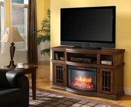 The Glendon Electric Fireplace Entertainment Center melds the contemporary styling of a curved electric firebox with a traditional designed mantel for a truly beautiful combination. This large media console can accommodate flat screen televisions up to 60-inches in size and offers ample storage with its extra wide center shelf and two side cabinets. The beautiful burnished pecan finish elegantly highlights every feature of this unit and brings instant warmth to your room.