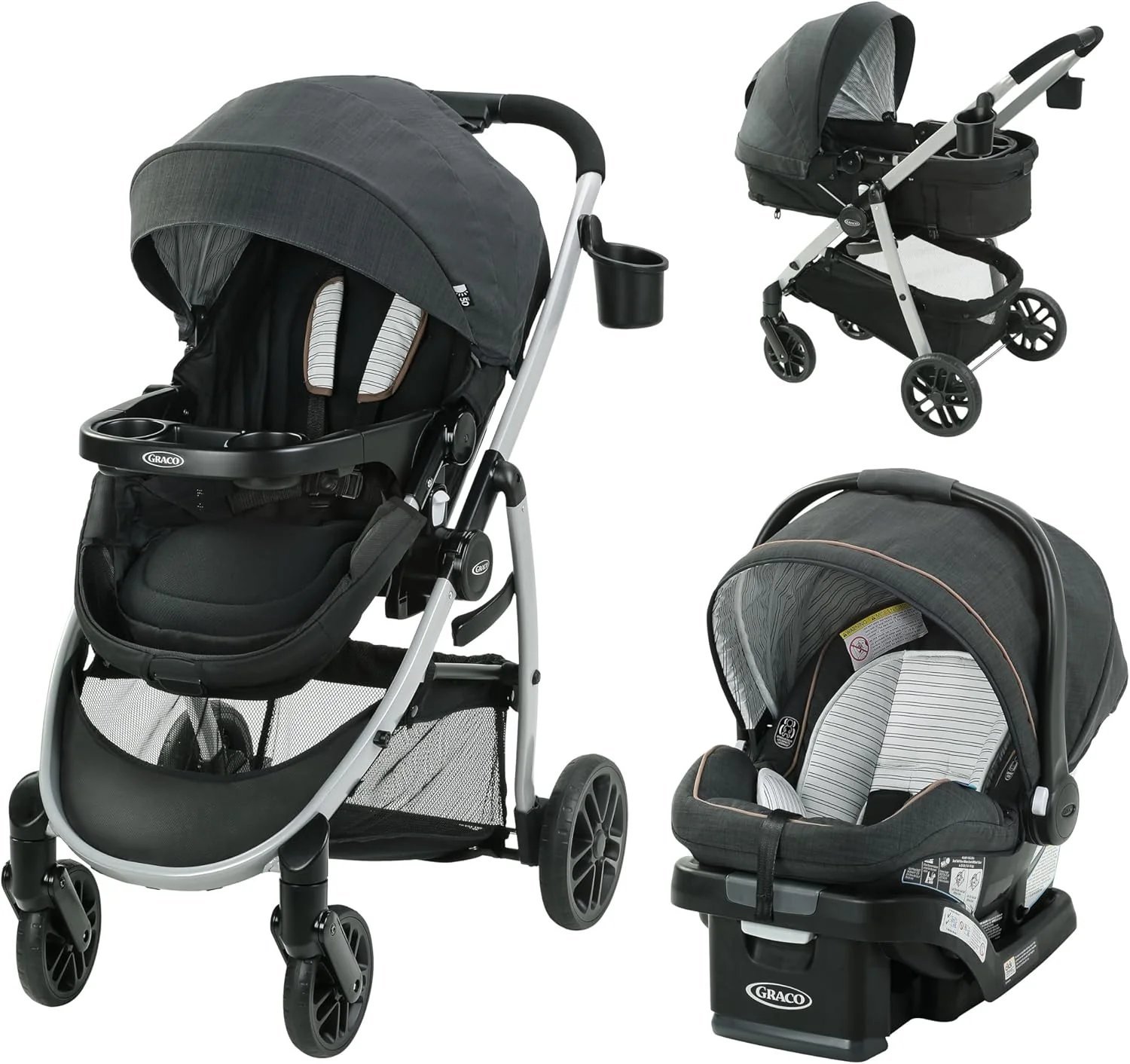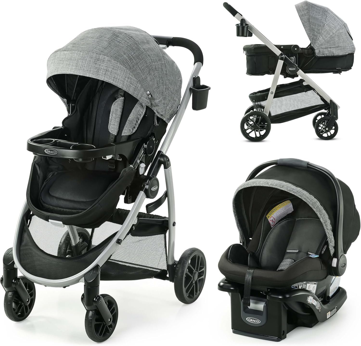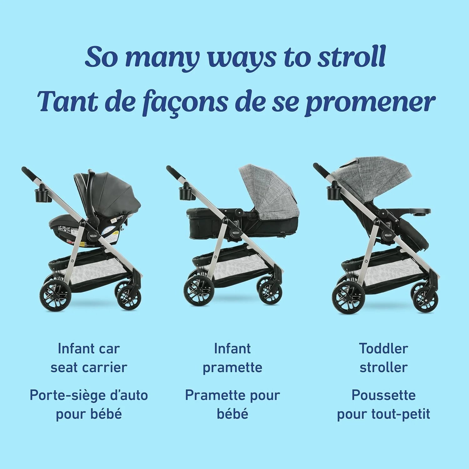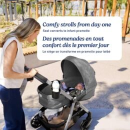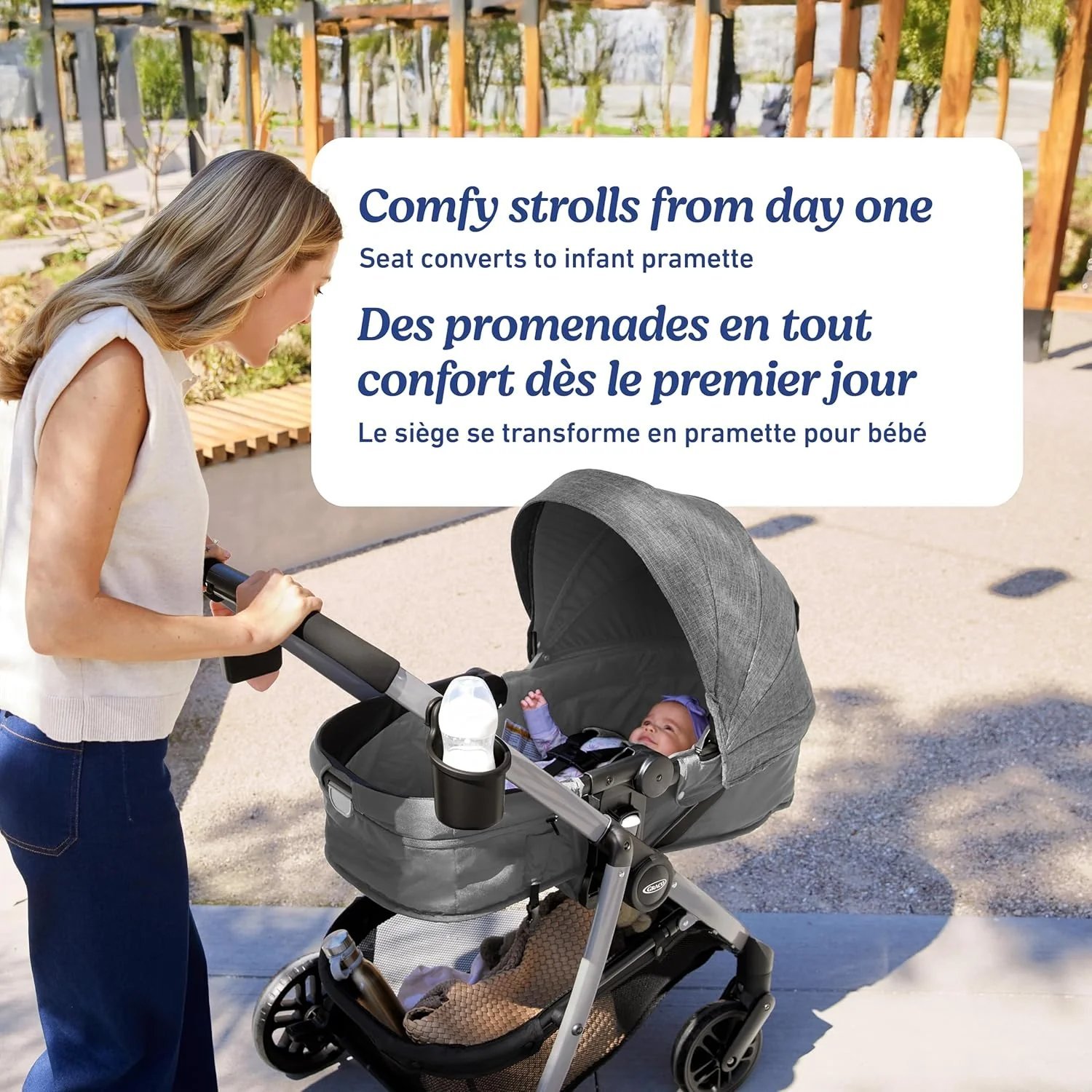 The Graco Modes Pramette Travel System offers you and your child more ways to stroll together, from baby to big kid. It’s 3 strollers in 1—Infant Car Seat Carrier, Infant Stroller, and Toddler Stroller—for a versatile stroll from infant to toddler. The toddler seat converts to a true infant stroller for comfortable strolls with your baby from day one. For even more options, the travel system includes the Graco SnugRide SnugLock 35 Infant Car Seat, and baby can ride parent-facing or forward-facing, thanks to a reversible stroller seat. With Modes Pramette Travel System, every ride is convenient with features such as a one-hand fold for easy storage and transportation. Extra touches like a removable child’s tray with cup holders, parent cup and phone holder, and large canopy with peekaboo window ensure an effortless and comfortable stroll every day.