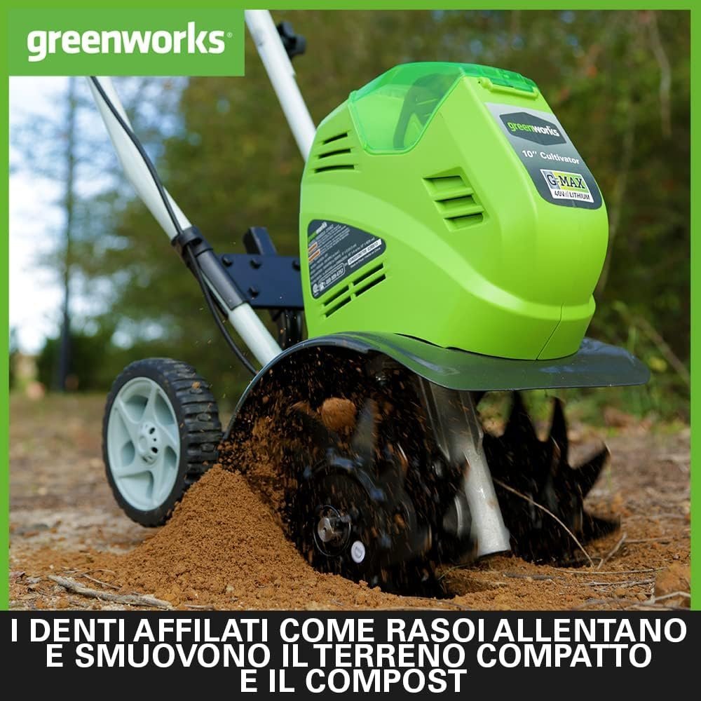 - Powerful battery-powered tiller (requires 40V battery)