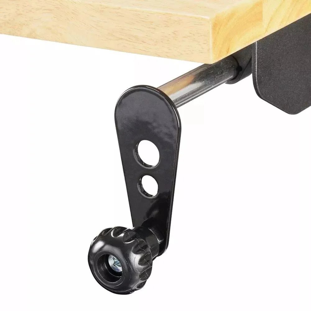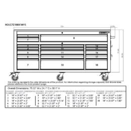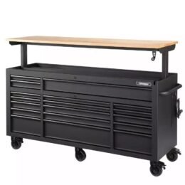 Raise your work to a whole new level with the innovative Husky 72 in. 18-Drawer Mobile Workbench with Adjustable-Height Top. The workbench has a revolutionary feature that allows you to adjust the height of the solid wood work surface according to your needs. A removable crank handle raises and lowers the top anywhere between 38 in. to 48 in. above the floor. This innovative design allows a better ergonomic standing position. which is known to help reduce strain on your body and joints. This rolling tool cabinet has heavier 19-Gauge steel. This workbench is 24 in. deep. which is 6 in. deeper than most standard rolling tool cabinets. providing more usable storage space that is strong enough to support 3.000 lbs. and has 33.545 cu. in. capacity. The 1.2 in. thick. solid wood top is coated with polyurethane for added utility and durability. Charge your power tools with the built-in. 6-outlet. 2 USB power center. The 100 lbs. rated. soft-close drawer slides keep the drawers from accidentally opening or from slamming shut. Drawer liners are included to protect and keep your tools in place. The top long drawer and three bottom drawers are equipped. with double 120 lbs. soft closing drawer slides for increased weight capacity up to 240 lbs. For added security. this unit is fitted with a barrel key and lock system. This mobile work center has 6 large. 5 in. x 2 in. all swivel casters and a steel tubular side handle. which allow you to easily move around. even when fully loaded.