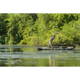The extra-wide standing deck offers an improved casting platform and convenient vantage point for sight fishing. allowing for superior vision from above while the revolutionary Guardian Transducer Shield gives you multidimensional vision below. The adjustable Vantage CTW seat provides 1.5′ of extra width and lumbar support for unmatched room and comfort for long days on the water. The Hobie H-Rail with integrated patented RAM® Hand-Track™ and numerous high-capacity storage compartments deliver the ultimate customization and organization in accessory mounting. ensuring that all of your gear is at your fingertips.