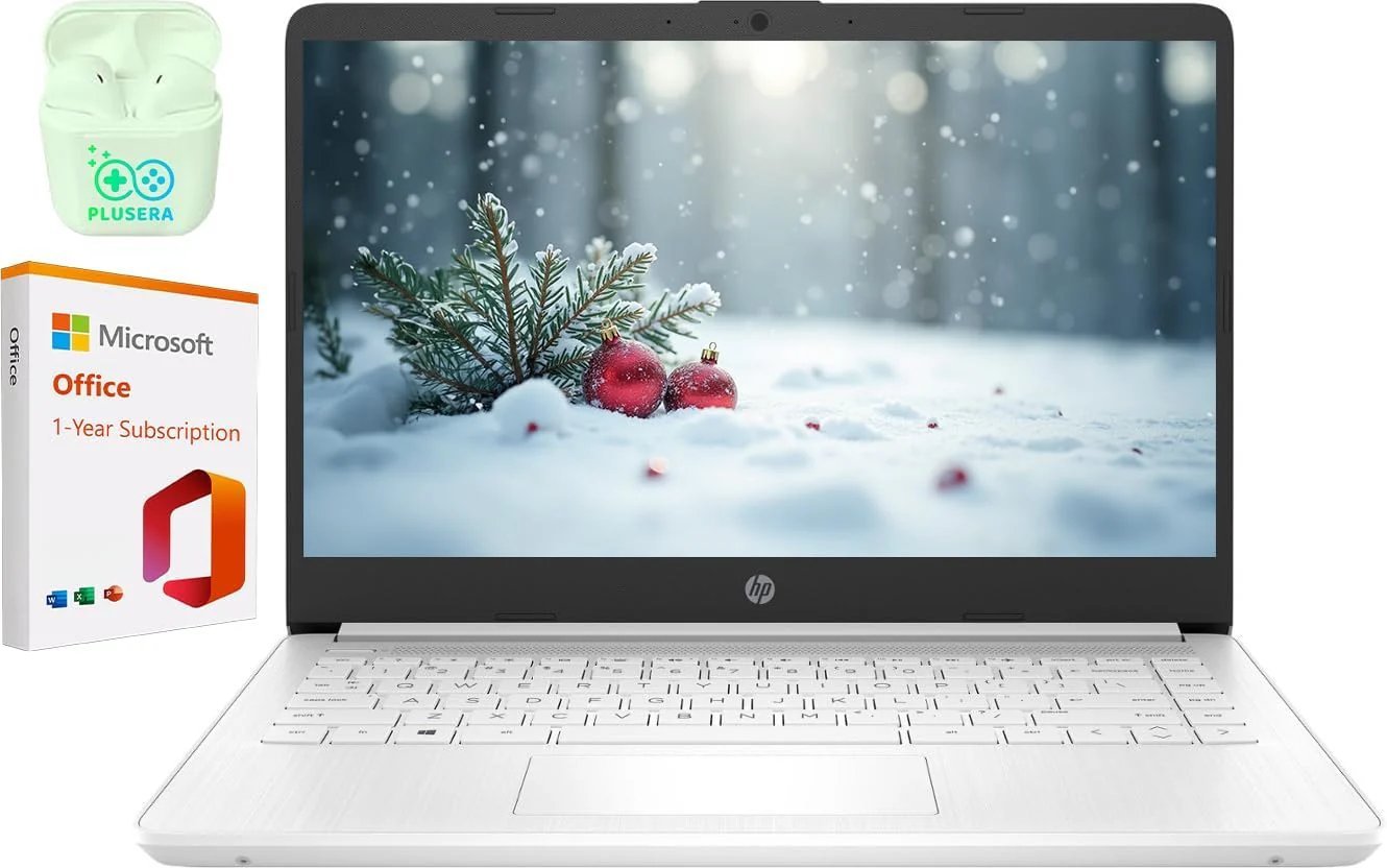 HP 14″ Business Laptop Computer, 16GB RAM 320GB Storage (64GB eMMC+256GB Docking Station Set), Intel Quad-Core N4120, Windows 11 S Laptop with 1-Year Microsoft Office 365, PLUSERA Earphones, White