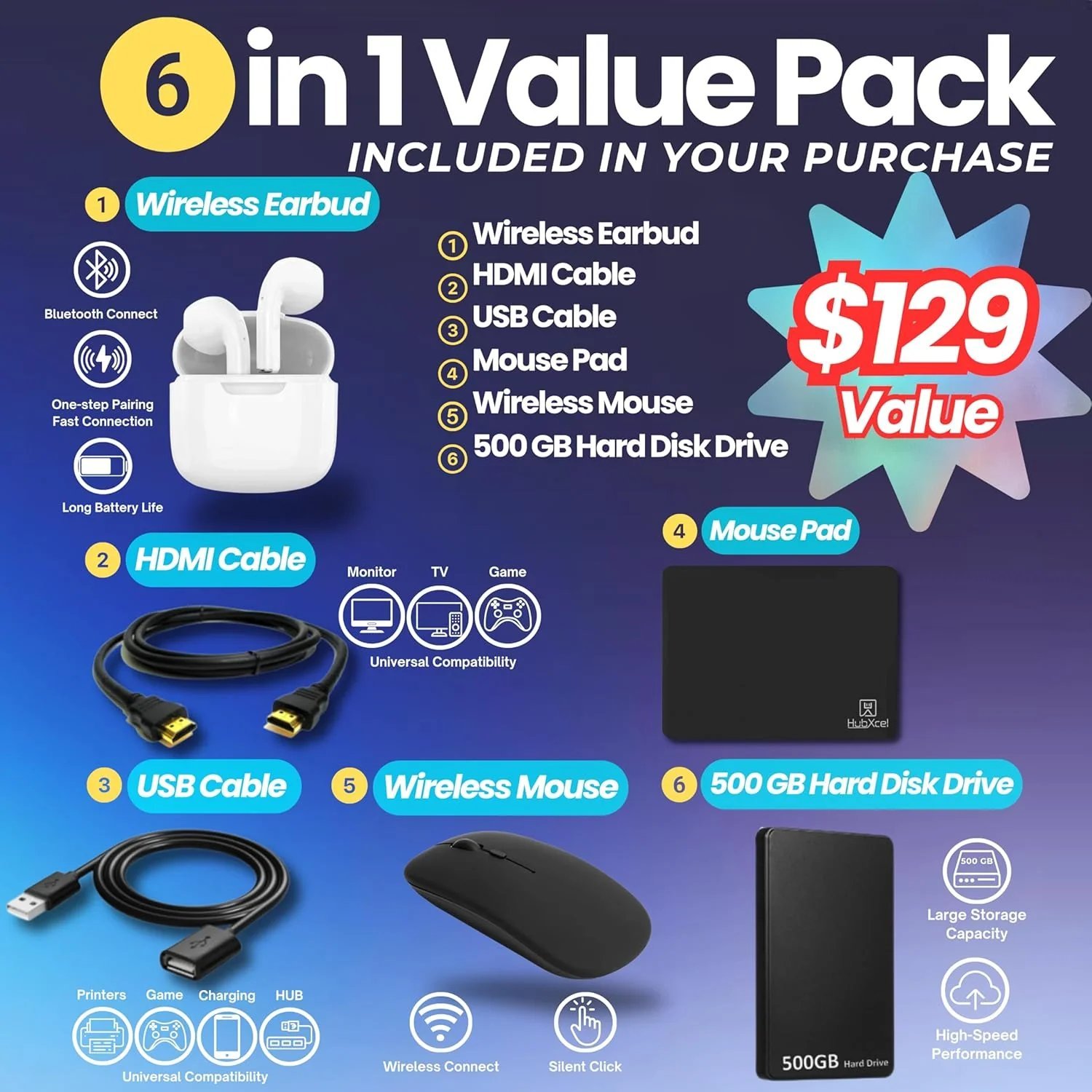 Accessory: HubxcelAccessory (Wireless earbuds, USB extension cord, HDMI cable, mouse pad, wireless mouse, and 500GB external hard drive)