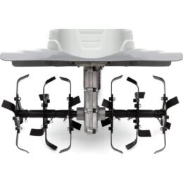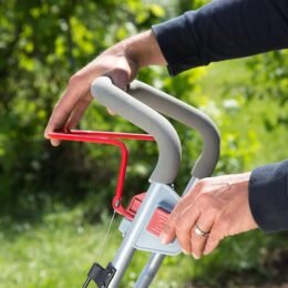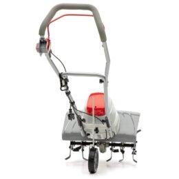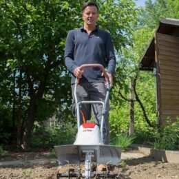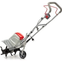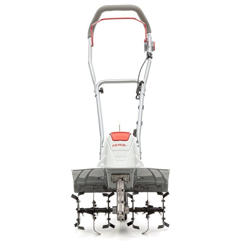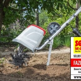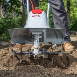 Ideal for loosening (softening) the soil and preparing the seedbed: Electric tiller – IKRA FEM 1500 Cultivator – The powerful IKRA tiller (1.500 W) is based on a high-performance 230 V electric motor (motor tiller electric). This motor guarantees a particularly low noise level when loosening the garden soil. The 24 blades of the 6 cutters (chopping roller) guarantee simple and effective treatment of the soil. The blades self-penetrate into the ground and ensure quiet operation when pruning. The blades slide up to 23cm into the ground. The height-adjustable brake spur (chopping spur) allows you to adjust and change the working depth easily and comfortably. The brake spur helps the tines of the tiller to dig deeper into the ground (depth adjustment/regulation). The further down the chopping spur is adjusted. the deeper the device inserts into the earth. The chopping spur helps determine the working depth. Chopping depth is crucial to achieve optimal results. The setting may vary depending on the nature of the soil. for example. sandy or clay soil. The working width of the hoe can be modified according to needs and the bed. The IKRA FEM 1500 electric tiller offers three different working widths depending on use. By removing two chopping units you achieve a working width of approx. 30 centimeters. If you remove two additional units. you get a working width of 17cm. which is particularly practical and useful for narrow flowerbed sections in your garden. If you use the 6 tine units provided. 45cm opens across your garden. The tiller is driven by means of a worm gear operating in an oil bath. This gear is particularly robust and requires no maintenance. The gardening tool has a mechanical safety brake. The safety brake ensures that the device stops immediately if. for example. the ground becomes too hard or if stones block the blades. The integrated safety switch serves as an ignition lock (child safety). Only after pressing this lock button can the electric garden tool be put into operation. after operating the power switch. If the device heats up too much. for example due to excessive stress. the overload protection automatically switches it off immediately for safety and motor protection purposes. The integrated transport wheel or support wheel is ideal for effortlessly moving the hoe from one place of use to another. For transport.the chopping spur is mounted so that the wheel is lowered and the hoe is ready for driving. To work. the chopping spur is mounted inverted so that the wheel is raised. The handle and carrying handle have a soft. non-slip coating. These are so-called soft. non-slip coated handles. The material ensures a particularly secure hold. Your hands are well supported and do not slip while working with the electric hoe. Thanks to the soft material. you will avoid blisters on your hands. The electric cultivator features cable strain relief. The plug remains perfectly fixed and does not lose its hold. The strain relief of the cable thus prevents any accidental loosening of the extension. The cable is further routed through this device so that it does not interfere with you while you work. Gardening work is thus carried out in complete comfort and without stress. Once gardening work is completed. the electric hoe can be easily stored in your garden shed. shed or garage. The stable. coated linkage (guide rail) folds quickly and easily.