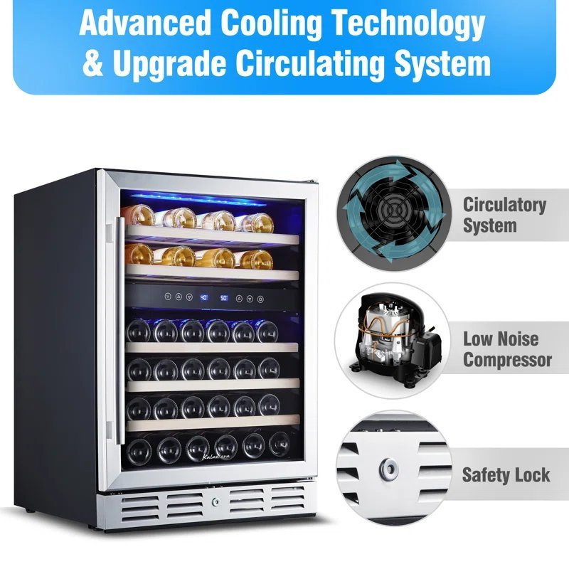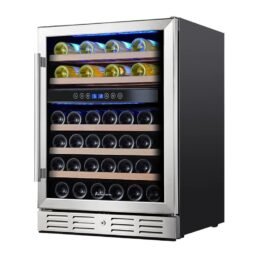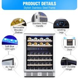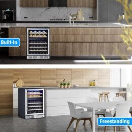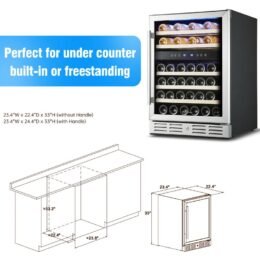 - 46 BOTTLE CAPACITY: Cooler has 5 beech wood shelves to hold each bottle securely and has spaces for 46 bottles of your favorite wine in different size. and is only affected when having larger bottle. like Pinot or Champagne. It’s the perfect choice for the wine lover having various wine collection.