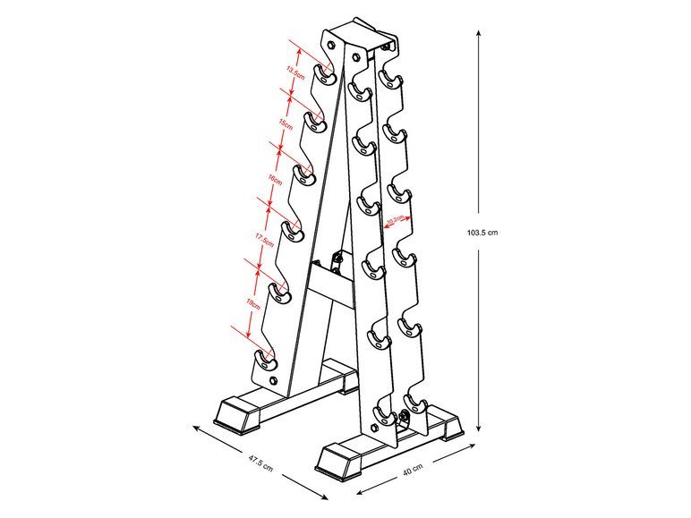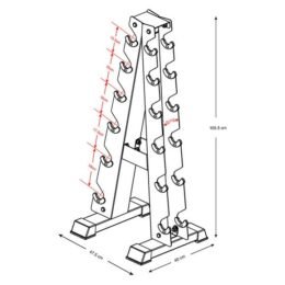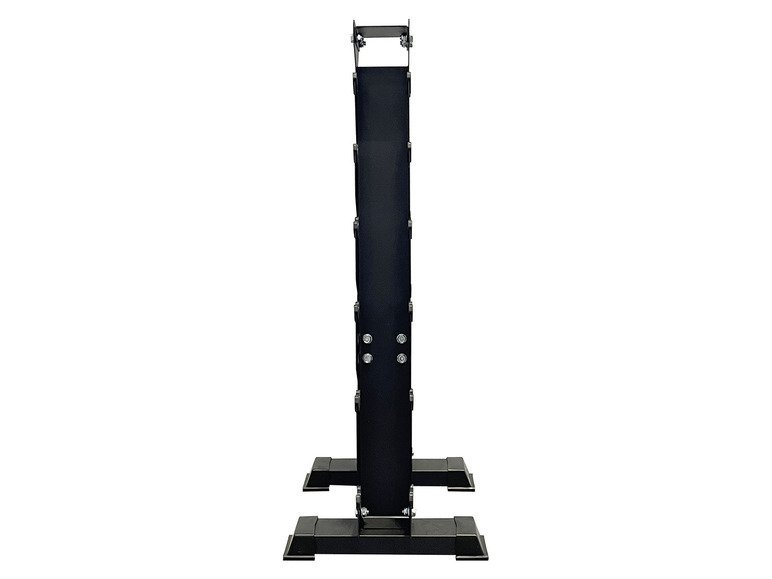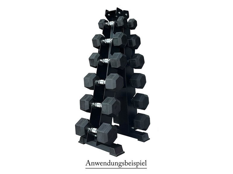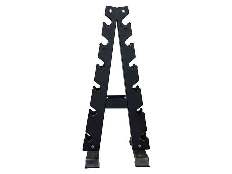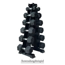 Das Hantel-Rack mit einer stabilen Stahlkonstruktion hat eine Tragkraft von insgesamt 110 kg und nimmt bis zu 6 Paar Hanteln auf. Durch den Aufbau als Hantel-Pyramide kann man aus jedem Hantelhalter die Hanteln gut entnehmen. Der Vorteil gegenüber Hantelbäumen – die Hanteln können mit den Scheiben montiert griffbereit gelagert werden. Der Hantelständer hat einen festen Stand und bodenschonende Fußkappen aus Kunststoff.