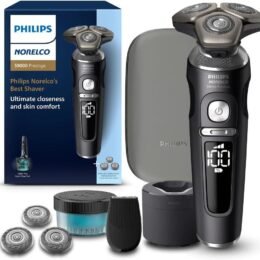 Experience the world’s closest electric shave and uncompromised skin comfort with Philips Norelco S9000 Prestige with wireless Qi-charging. Dual SteelPrecision blades are strengthened with nano particles and have extra strong and long-lasting sharp edges to cut hair with the highest precision for the closest results. SenseIQ technology senses and adapts to every contour of your face to catch difficult hair. Our excellent skin comfort system enables you to effortlessly get a highly efficient shave, even on a longer (up to 7-day) beard. Its new wider, rounder openings catch more hair per pass, resulting in a difference you can feel. The Smart Hair Sensor checks hair density 500 times per second and automatically adapts the shaver to your hair. Choose between 3 modes to customize your shave: 1) Comfort – for a gentle, thorough shave. 2) Dynamic – for a thorough, everyday shave. 3) Efficiency – for a quick shave that saves you time. Get a convenient dry shave or a more refreshing wet shave with gel or foam – even in the shower. Finish your look with the skin-friendly click-on precision trimmer. It is ideal for maintaining your mustache and trimming your sideburns. The premium pouch protects the shaver as well as its accessories and wireless Qi charging pad. Its thoughtful design matches the timeless elegance of the shaver. Shave longer with every charge, thanks to a powerful and long-lasting Lithium-ion battery. You’ll have up to 60 minutes of shaving time �C that’s about 21 shaves. Wirelessly charge your shaver or any other Qi-compliant device by simply placing it on the Qi charging pad. Clean the shaver easily and thoroughly under the tap. Simply open the shaving head and rinse both sides under running water to get it perfectly clean. This shaver only operates in cordless mode. For best shaving performance, replace your shaving heads every 12 months. Use SH91/52 replacement heads, sold separately.