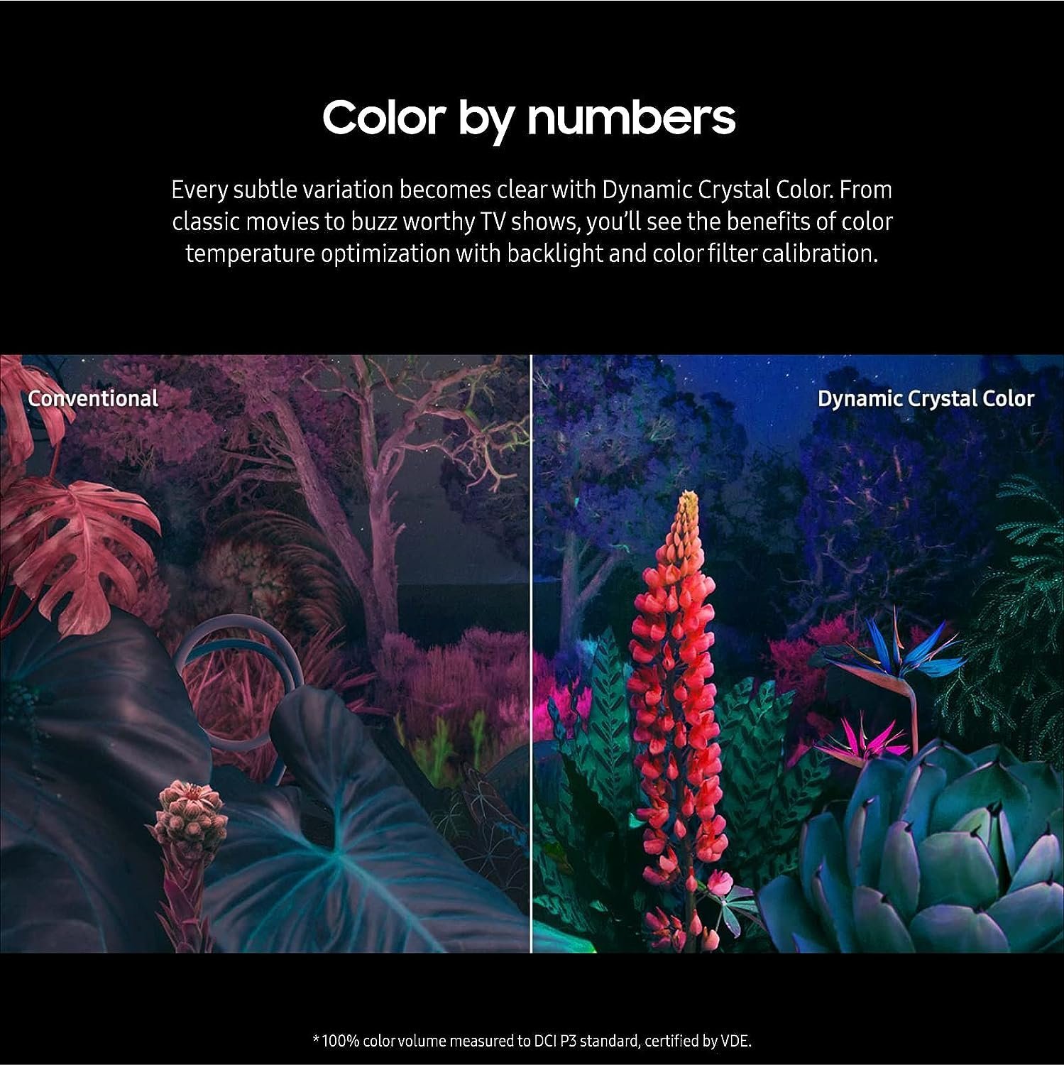 - DYNAMIC CRYSTAL COLOR: A billion shades of color pop into view when you turn on this TV; Every subtle variation becomes clear with Dynamic Crystal Color—tech that achieves a different level of UHD using advanced technology.voltage : 120 volts
