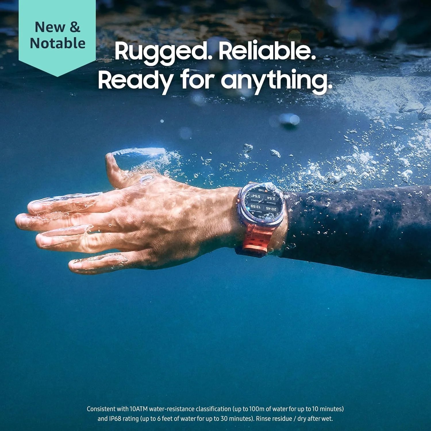 ¹Consistent with 10ATM water-resistance classification (up to 100m of water for up to 10 minutes) and IP68 rating (up to 6 feet of water for up to 30 minutes). Rinse residue / dry after wet. ²Galaxy AI features track data and requires compatible Samsung Galaxy phone, Samsung Health app and Samsung Account. ³Available for outdoor running and cycling only. Must follow the same starting point and path as a workout selected from up to 14 days prior. ⁴The heart rate software functions are not intended for medical use. ⁵Requires compatible smartphone. ⁶Requires network connection to notify emergency contact. GPS accuracy may be affected by obstructions to satellite signal such as buildings. ⁷To activate press Quick Button for 5 seconds; to deactivate press for 3 seconds. ⁸Based on typical use; results may vary. ¹⁰GPS accuracy may be affected by weather, atmosphere and other obstructions such as buildings and tall trees. ¹¹Track Back feature leads back to the start of trail for hiking or cycling. Option is only available if you have tracked your route. ¹²Must wear device for 7 nights during a 30 night period. ¹³The Sleep Apnea Feature is an over-the-counter (OTC) software-only, mobile medical application operating on a compatible Samsung Galaxy Watch and phone. This feature is intended to detect signs of moderate to severe obstructive sleep apnea in the form of significant breathing disruptions in adult users 22 years and older, over a two-night monitoring period. It is intended for on-demand use. This feature is not intended for users who have previously been diagnosed with sleep apnea. Users should not use this feature to replace traditional methods of diagnosis and treatment by a qualified clinician. The data provided by this device is also not intended to assist clinicians in diagnosing sleep disorders.