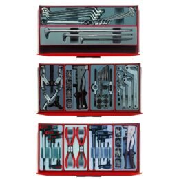 - + MORE Impact driver set. punches and chisels. ratcheting screwdriver and bits. pullers. nutsert tools. taps and dies. T-handle hex keys. rivet tools. pry bars. torque wrench. oil service tools. extractor and nut splitting tools. hammer. tape measure. hacksaw. knife. side panel. hooks and empty tool trays for storing consumables and spare parts.(see INCLUDED PRODUCTS section below for full details).