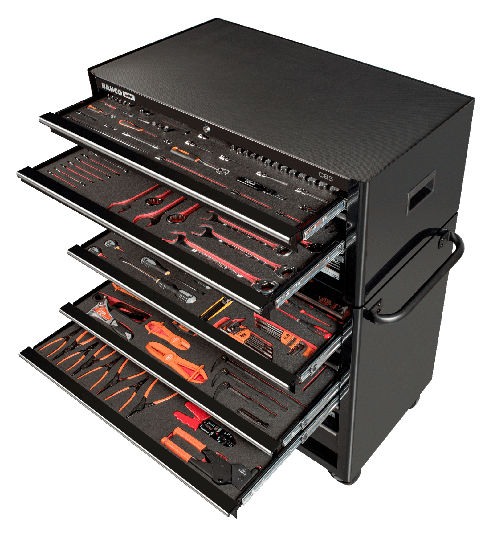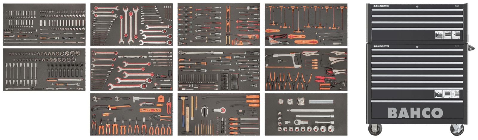 - Heavy duty 40″ tool trolley composed of 8 drawer C75 trolley plus 4 drawer E85 top chest plus foam assortment